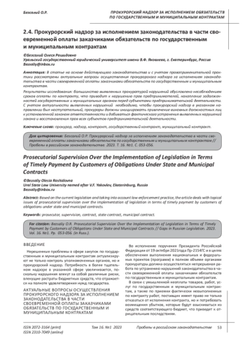 В статье на основе действующего законодательства и с учетом правоприменительной практики рассмотрены актуальные вопросы осуществления прокурорского надзора за исполнением законодательства в части своевременной оплаты заказчиками обязательств по государственным и муниципальным контрактам. Результаты исследования: большинство выявленных прокуратурой нарушений обусловлено несоблюдением сроков оплаты по контракту, что приводит к нарушению прав предпринимателей, накопление задолженностей государственных и муниципальных органов перед субъектами предпринимательской деятельности. С учетом актуальности выявленных нарушений необходимо, чтобы прокурорский надзор в указанном направлении был наступательный, прокуроры должны инициировать привлечение виновных должностных лиц к установленной законом ответственности и добиваться фактического устранения выявленных нарушений закона и восстановления прав всех субъектов предпринимательской деятельности.