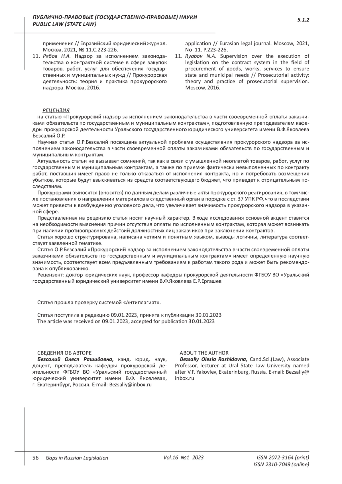 Ryabov N.A. Supervision over the execution of legislation on the contract system in the field of procurement of goods, works, services to ensure state and municipal needs // Prosecutorial activity: theory and practice of prosecutorial supervision. Moscow, 2016.