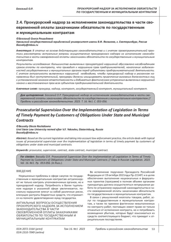 Rudykh S.N. Some issues of prosecutorial supervision over the implementation of anti-corruption legislation in the procurement of goods, works, services to ensure state and municipal needs // Textbook, ed. S.N. Rudykh, V.N. Shikhanov, N.V. Subanov, Irkutsk, 2020. EDN: CZVXIB