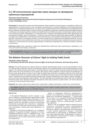 В настоящей статье рассматривается право граждан на организацию и проведение публичных мероприятий, а также участие в них, как право относительное с учетом проблемных аспектов реализации субъектами исследуемой прерогативы. Актуальность выбранной тематики представлена необходимостью более глубокого теоретического изучения права на проведение публичных мероприятий ввиду формирования у отдельных категорий граждан ошибочного представления об абсолютности исследуемого права и ростом числа публичных акций, проводимых не в соответствии с нормами законодательства либо нарушающих общественный порядок. Цель исследования - выявление относительного характера права граждан на проведение публичных мероприятий. Для достижения указанной цели использовались общенаучные и частнонаучные методы: логический, системный методы, а также исторический и сравнительно-правовой методы. В исследовании выявлены такие проблемные аспекты, как отсутствие достаточного теоретического изучения абсолютных и относительных границ права граждан на публичные мероприятия. Основные выводы изложены в заключении.