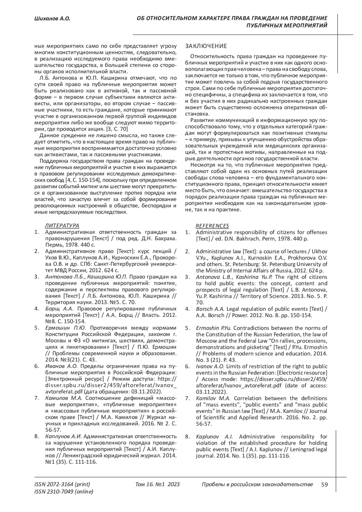 Antonova L.B., Kashirina Yu.P. The right of citizens to hold public events: the concept, content and prospects of legal regulation [Text] / L.B. Antonova, Yu.P. Kashirina // Territory of Science. 2013. No. 5. P. 70.