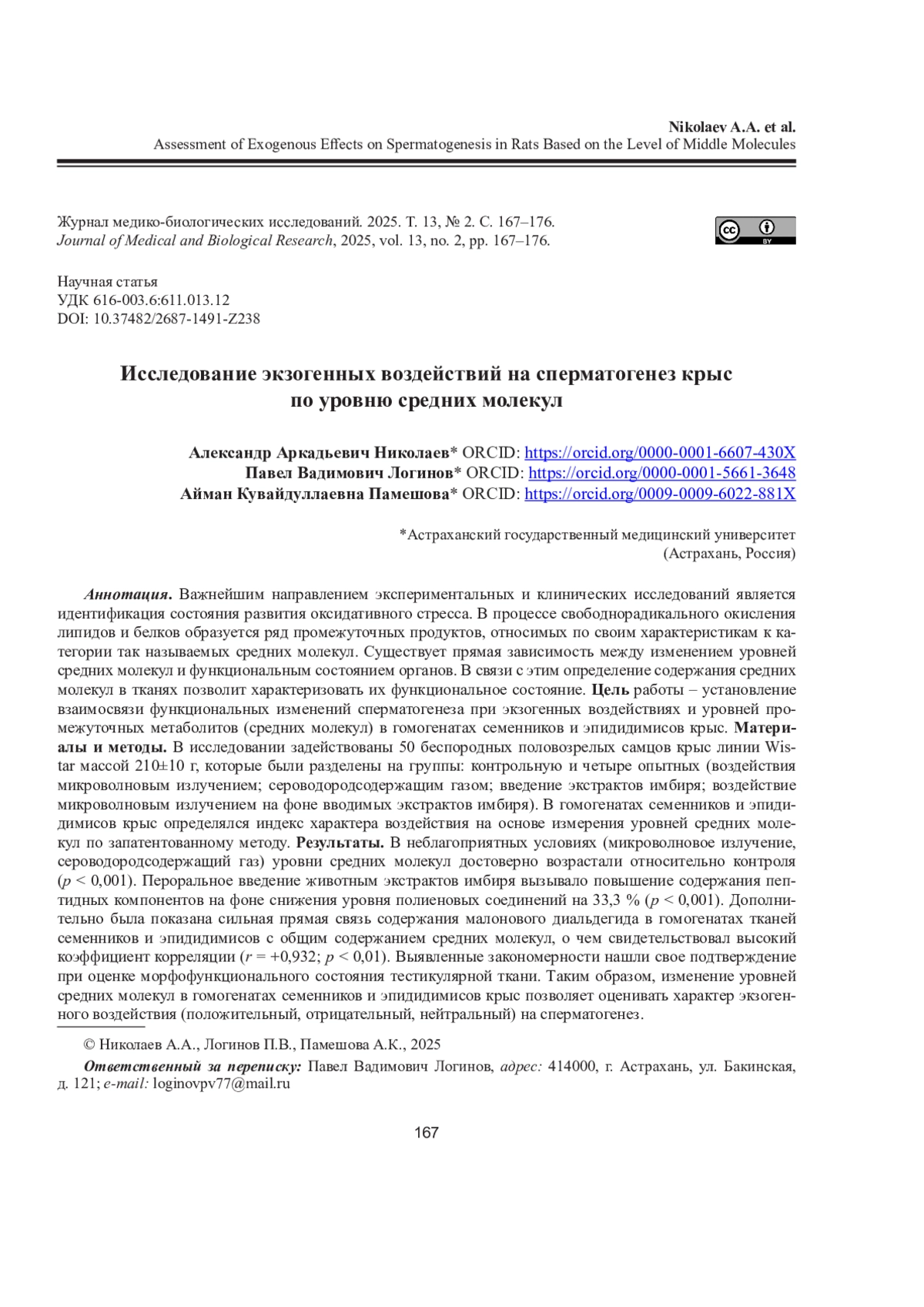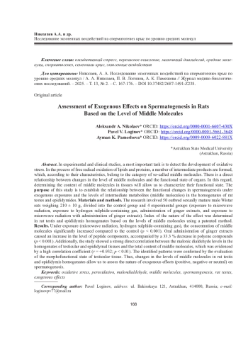 Результаты. В неблагоприятных условиях (микроволновое излучение, сероводородсодержащий газ) уровни средних молекул достоверно возрастали относительно контроля (p < 0,001). Пероральное введение животным экстрактов имбиря вызывало повышение содержания пептидных компонентов на фоне снижения уровня полиеновых соединений на 33,3 % (p < 0,001). Дополнительно была показана сильная прямая связь содержания малонового диальдегида в гомогенатах тканей семенников и эпидидимисов с общим содержанием средних молекул, о чем свидетельствовал высокий коэффициент корреляции (r = +0,932; p < 0,01). Выявленные закономерности нашли свое подтверждение при оценке морфофункционального состояния тестикулярной ткани. Таким образом, изменение уровней средних молекул в гомогенатах семенников и эпидидимисов крыс позволяет оценивать характер экзогенного воздействия (положительный, отрицательный, нейтральный) на сперматогенез.