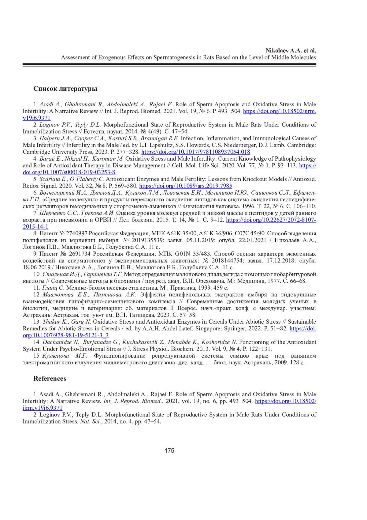 1. Asadi A., Ghahremani R., Abdolmaleki A., Rajaei F. Role of Sperm Apoptosis and Oxidative Stress in Male Infertility: A Narrative Review // Int. J. Reprod. Biomed. 2021. Vol. 19, No 6. P. 493-504. DOI: 10.18502/ijrm.v19i6.9371 EDN: ZYVIRK