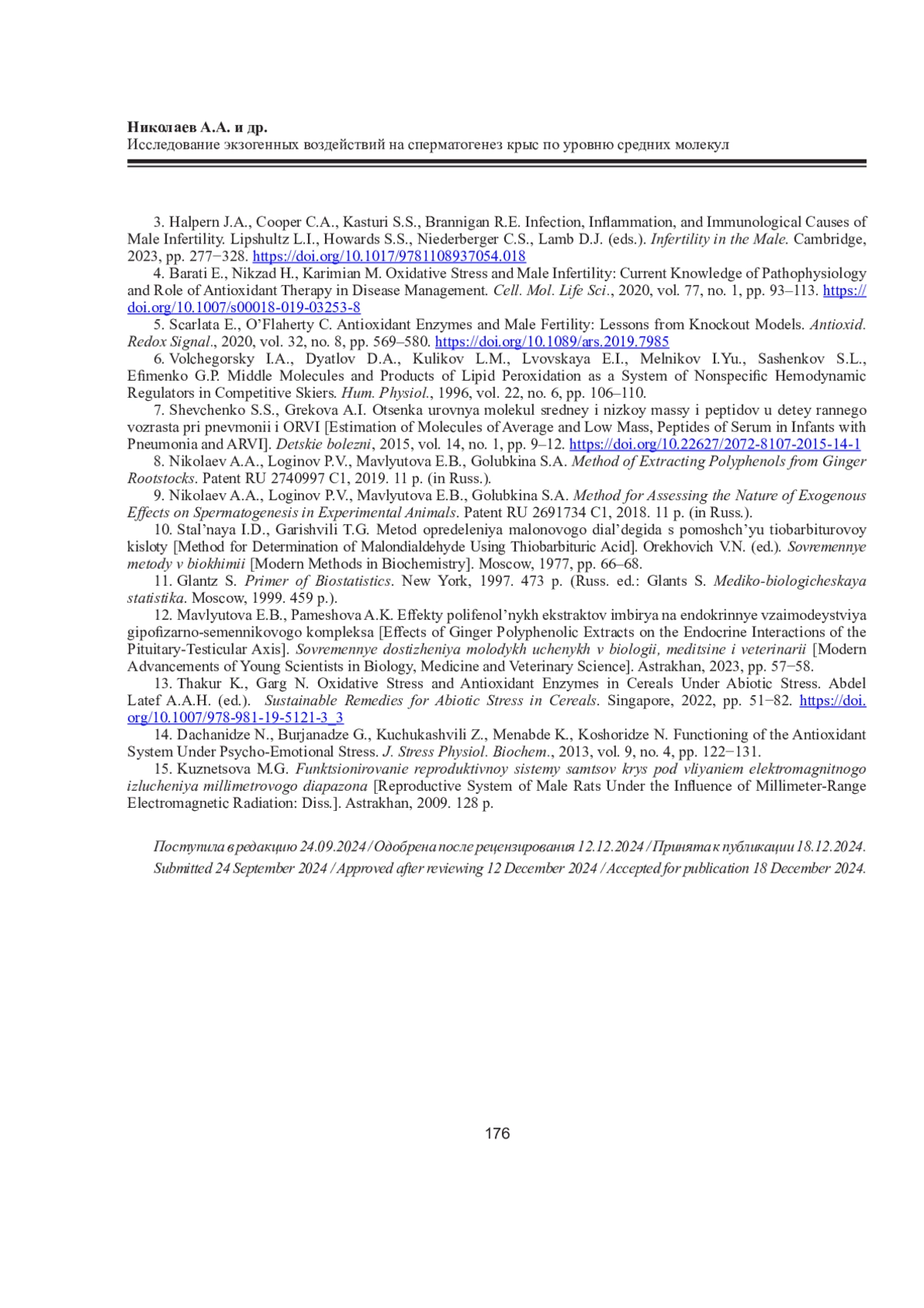 12. Мавлютова Е.Б., Памешова А.К. Эффекты полифенольных экстрактов имбиря на эндокринные взаимодействия гипофизарно-семенникового комплекса // Современные достижения молодых ученых в биологии, медицине и ветеринарии: сб. материалов II Всерос. науч.-практ. конф. с междунар. участием. Астрахань: Астрахан. гос. ун-т им. В.Н. Татищева, 2023. С. 57-58. EDN: DVXQIX