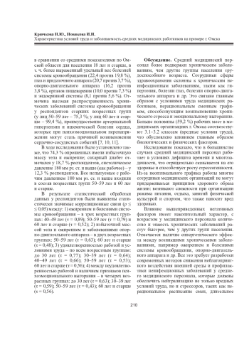 Результаты. На основании оценки условий труда установлено, что 59,2 % рабочих мест средних медицинских работников в лечебно-профилактических организациях г. Омска соответствовали 3.1-3.2 классам (вредные условия труда). Это обусловлено негативным влиянием биологических, физических и психологических факторов внешней среды. Отмечены следующие особенности профессиональной деятельности среднего медицинского персонала: 1) сменный график работы; 2) многозадачность; 3) работа в условиях дефицита времени; 4) выполнение дополнительных функций в условиях пандемии COVID-19. Медицинские работники подвержены хроническому стрессу, для них характерно эмоциональное выгорание, способствующее отказу от ведения здорового образа жизни. Воздействие негативных факторов внешней среды накапливается со временем, в результате у медицинских работников с возрастом хронические заболевания развиваются чаще и протекают тяжелее по сравнению с другими группами населения. Для повышения эффективности профессиональной деятельности и трудового долголетия средних медицинских работников необходима разработка современных методов, позволяющих снизить влияние негативных факторов профессиональной среды на их организм, а также методов профилактики неинфекционных заболеваний, в т. ч. с применением цифровых технологий.