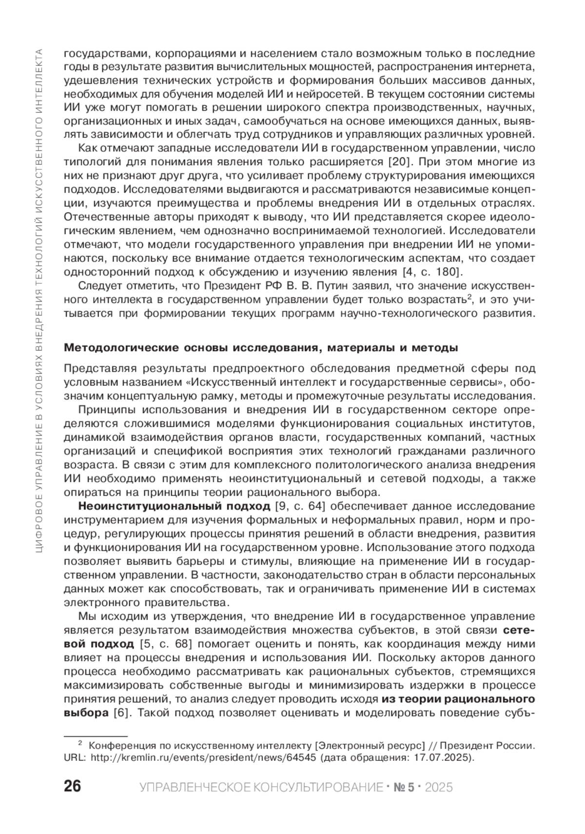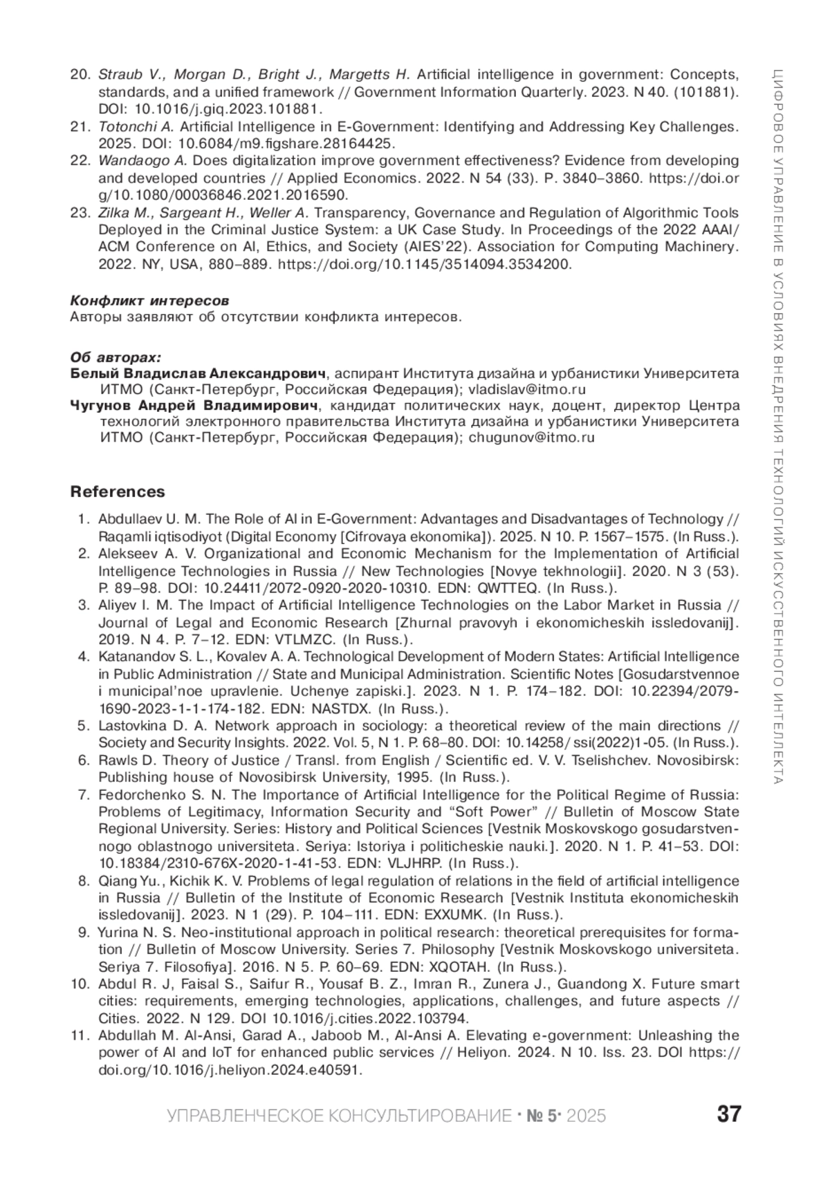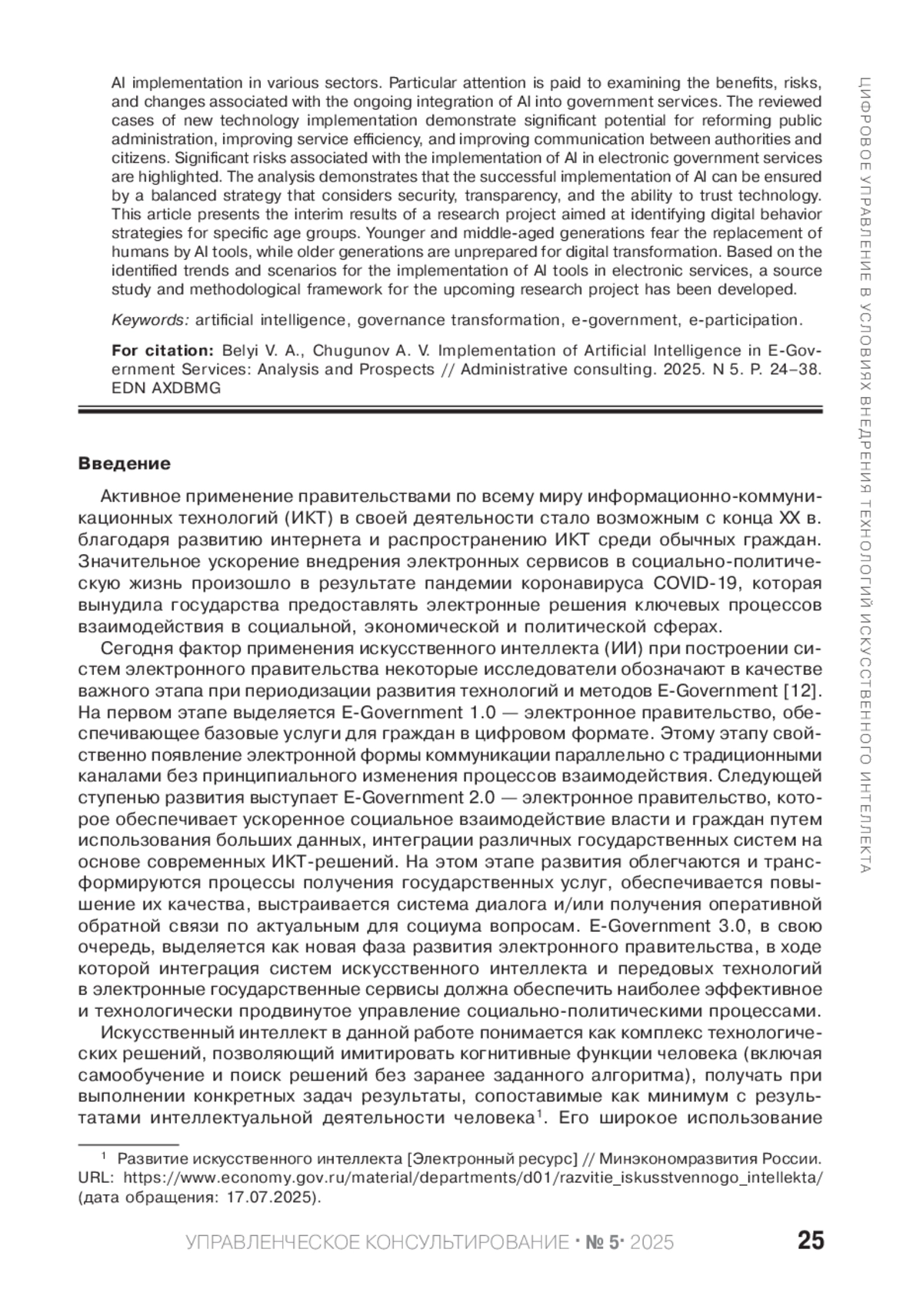 БЕЛЫЙ В. А., ЧУГУНОВ А. В. ВНЕДРЕНИЕ ИСКУССТВЕННОГО ИНТЕЛЛЕКТА В ЭЛЕКТРОННЫЕ ГОСУДАРСТВЕННЫЕ СЕРВИСЫ: АНАЛИЗ И ПЕРСПЕКТИВЫ РАЗВИТИЯ // УПРАВЛЕНЧЕСКОЕ КОНСУЛЬТИРОВАНИЕ. 2025. № 5 (191)