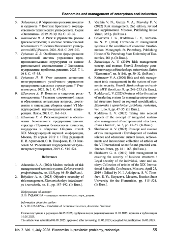 1. Адаменко А. А. Современные методы управления рисками экономических систем // Деловой вестник предпринимателя. 2024. № 1(15). С. 46-50. EDN: ZUYGQV