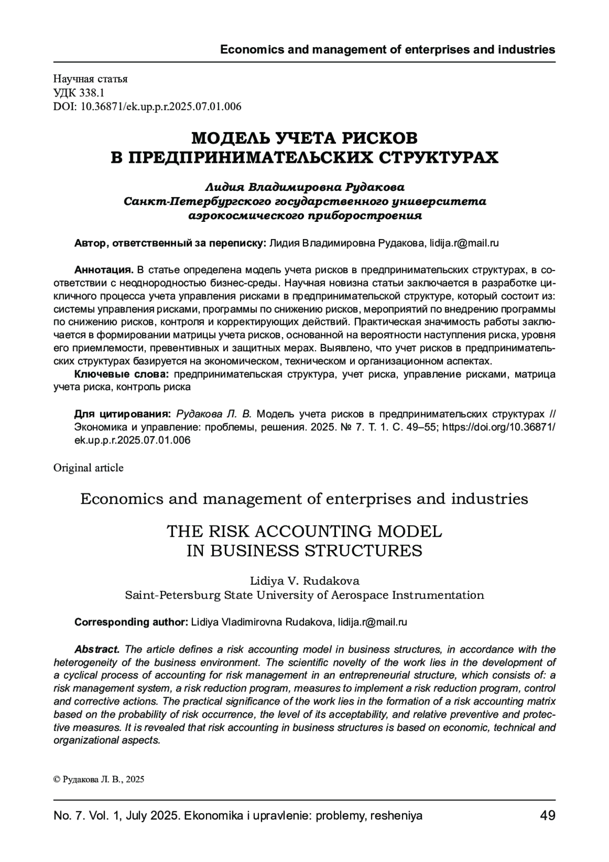 7. Рудакова Л. В. Особенности формирования алертинговой системы управления предпринимательскими структурами на основе региональной специализации // Экономика и управление: проблемы, решения. 2023. Т. 1, № 8. С. 47-55. EDN: RGZBAU