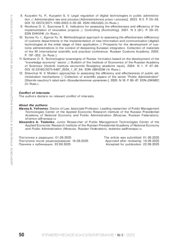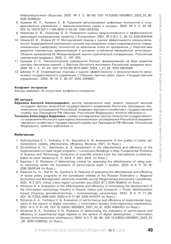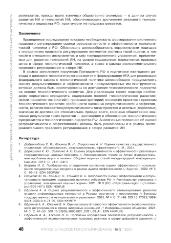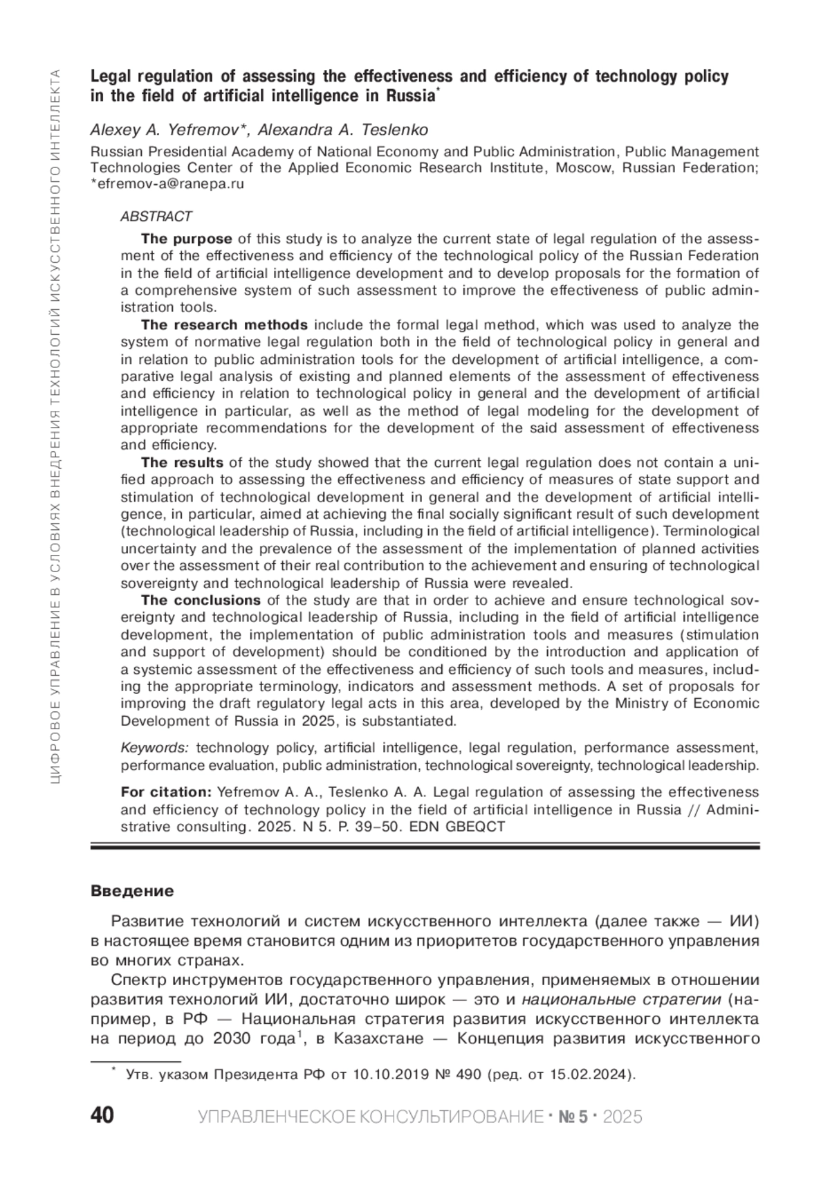 ЕФРЕМОВ А. А., ТЕСЛЕНКО А. А. ПРАВОВОЕ РЕГУЛИРОВАНИЕ ОЦЕНКИ РЕЗУЛЬТАТИВНОСТИ И ЭФФЕКТИВНОСТИ ТЕХНОЛОГИЧЕСКОЙ ПОЛИТИКИ В СФЕРЕ ИСКУССТВЕННОГО ИНТЕЛЛЕКТА В РОССИИ // УПРАВЛЕНЧЕСКОЕ КОНСУЛЬТИРОВАНИЕ. 2025. № 5 (191)