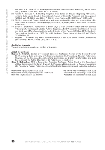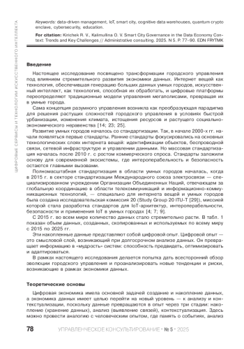 КИРИЧЕК Р. В., КАЛИМУЛЛИНА О. В. УПРАВЛЕНИЕ УМНЫМ ГОРОДОМ В КОНТЕКСТЕ ЭКОНОМИКИ ДАННЫХ: ТЕНДЕНЦИИ И КЛЮЧЕВЫЕ ВЫЗОВЫ // УПРАВЛЕНЧЕСКОЕ КОНСУЛЬТИРОВАНИЕ. 2025. № 5 (191)