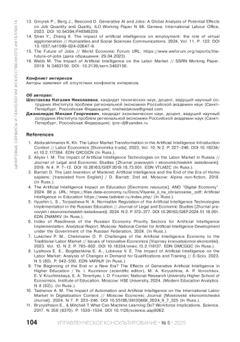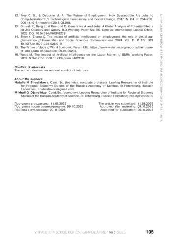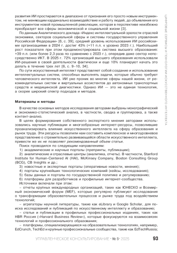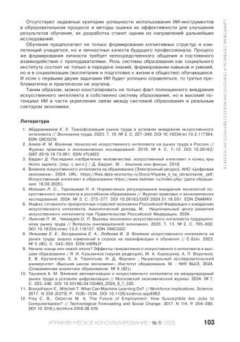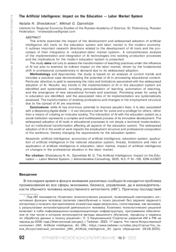 ШЕСТАКОВА Н. Н., ДЖАНЕЛИДЗЕ М. Г. ИСКУССТВЕННЫЙ ИНТЕЛЛЕКТ: ВОЗДЕЙСТВИЕ НА СИСТЕМУ «ОБРАЗОВАНИЕ — РЫНОК ТРУДА» // УПРАВЛЕНЧЕСКОЕ КОНСУЛЬТИРОВАНИЕ. 2025. № 5 (191)