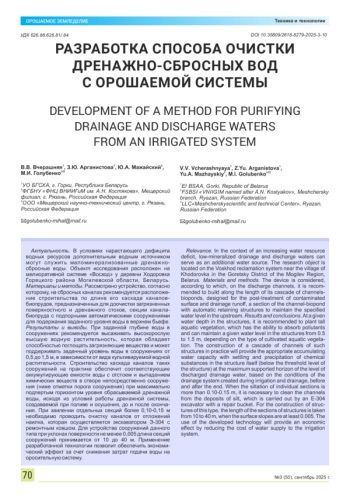 4. Дрововозова Т.И., Кириленко А.А. Совершенствование технического подхода к управлению процессом локальной очистки дренажного стока с орошаемых земель // Мелиорация и гидротехника. 2023. Т. 13. № 2. С. 94-108.