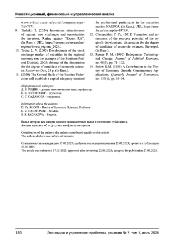 2. Ворошилова И. В., Родин Д. Я. Финансовый рынок как источник развития инвестиционного потенциала региональной экономики // Финансы и кредит. 2008. № 19(307). C. 52-58.