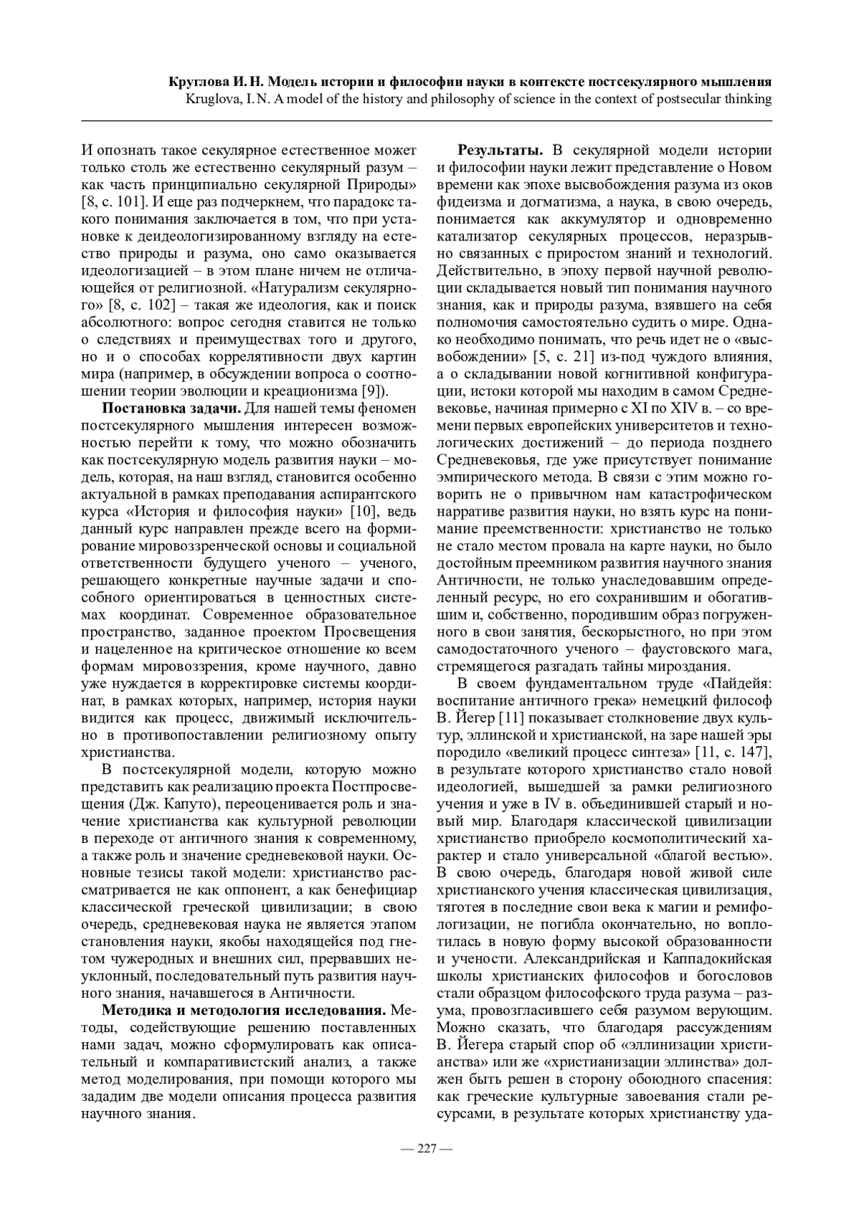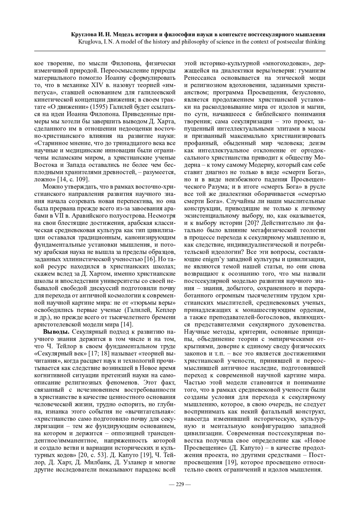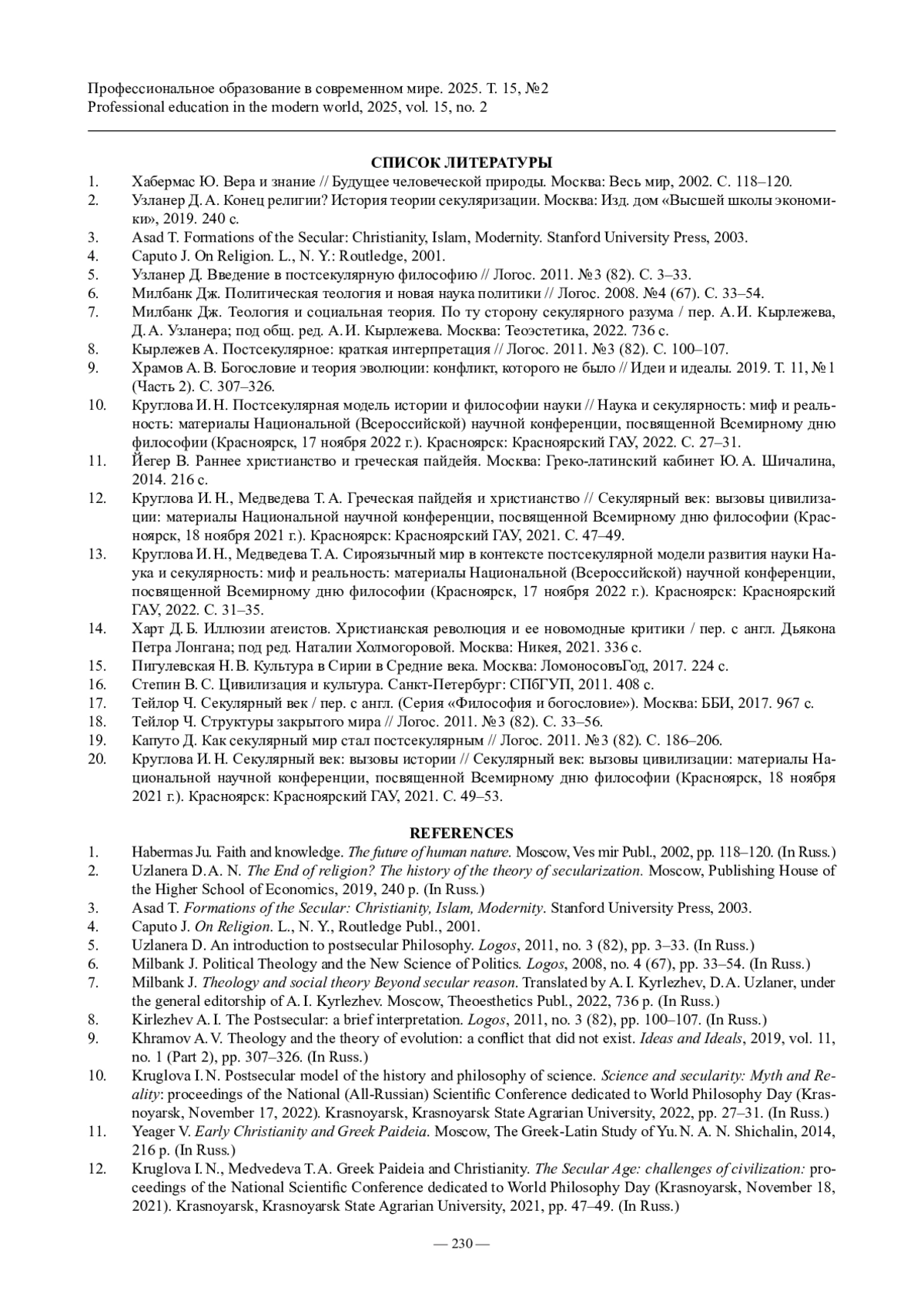 10. Круглова И.Н. Постсекулярная модель истории и философии науки // Наука и секулярность: миф и реальность: материалы Национальной (Всероссийской) научной конференции, посвященной Всемирному дню философии (Красноярск, 17 ноября 2022 г.). Красноярск: Красноярский ГАУ, 2022. С. 27-31.