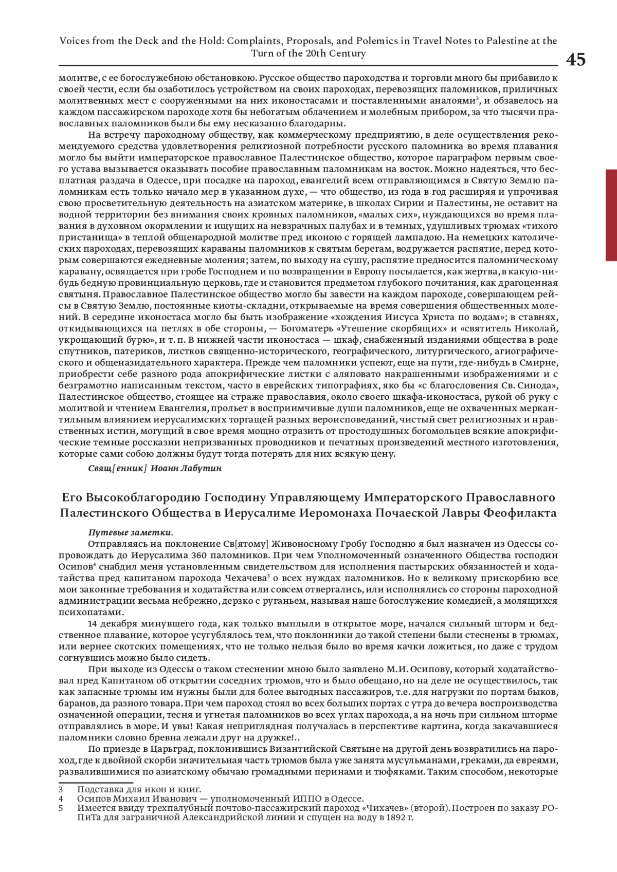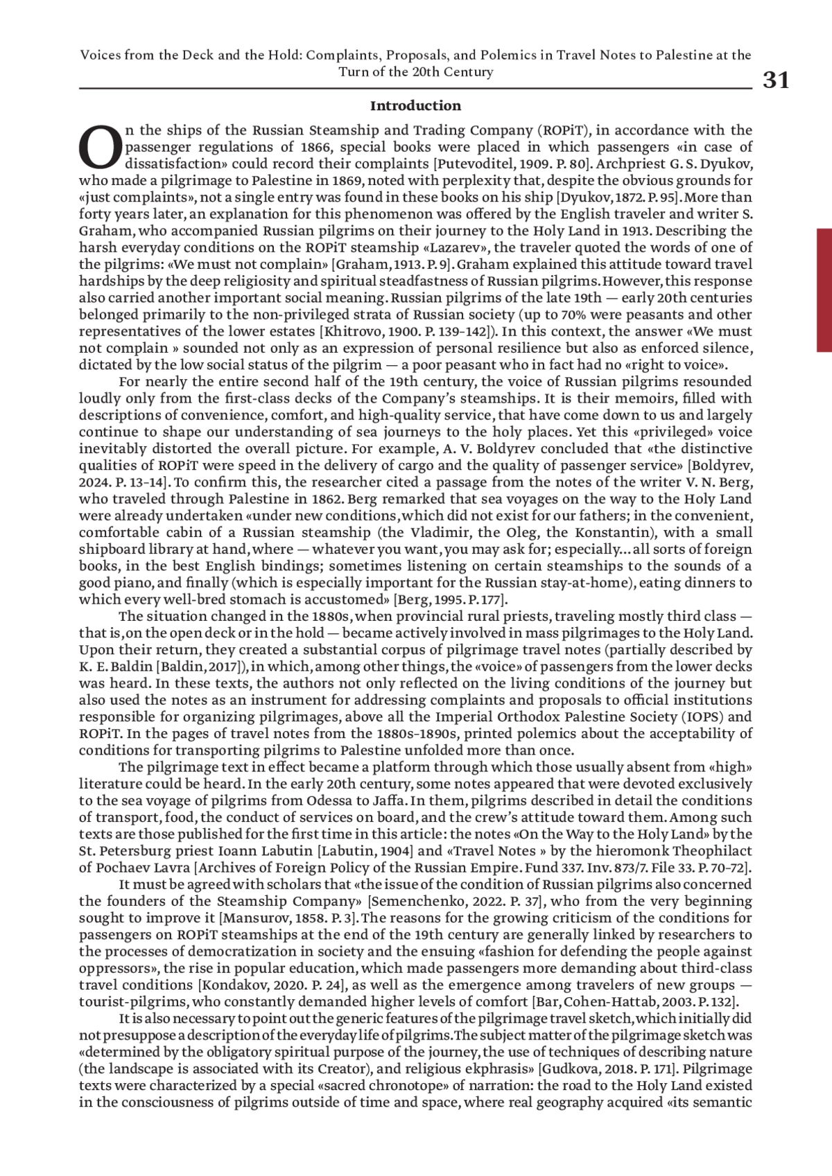 The aim of this study is to analyze the specific ways in which the voices of deck and hold passengers were represented in Russian pilgrimage literature at the turn of the 19th–20th centuries. Based on a systematic analysis of travel and pilgrimage accounts by G. Dyukov, A. Eliseev, A. Korovitsky, I. Bartsikhovsky, P. Bobrov, F. Grekov, and other authors, the article examines changes in the pilgrimage narrative and the mechanisms by which deck and hold passengers of the Russian Steamship and Trading Company (ROPiT) were able to express their views on the conditions of their journey to the Holy Land. Special attention is given to the analysis of the «voices from above», belonging to privileged first-class travelers, and the «voices from below», represented in texts primarily by provincial clergymen. The article also explores the activities of the Imperial Orthodox Palestine Society (IOPS), which systematically sought to improve the conditions of transportation for non-privileged passengers aboard ROPiT steamships. The response of the steamship company to public criticism of conditions on the maritime leg of the pilgrimage to Jerusalem is discussed, including conversations with ship crews and the publication of instructions and circulars on the organization of passenger transport on Russian steamships. In parallel, the printed polemics of V. Dedlov and A. Koptev are considered, reflecting an «upper-level» debate on the regulation of pilgrimage transportation. Particular attention is devoted to the evolution of the pilgrimage account as a genre. Within the framework of the article, for the first time, notes such as «On the Way to the Holy Land» by the St. Petersburg priest Ioann Labutin (1904) and «Travel Notes» by the hieromonk Theophilact of Pochaev Lavra (1914) are published. These texts combine pilgrimage narrative with observations of the everyday life of third-class passengers and serve as vivid evidence of the transformation of the «voice from below» in Russian pilgrimage literature at the turn of the 19th–20th centuries. The authors conclude that, although the «voice» of non-privileged pilgrims was most often expressed indirectly — through clergymen — it was precisely the latter who became an important channel for articulating social demands and a factor in the institutionalization of care for pilgrims. At the same time, the problems associated with the transportation of pilgrims to the Holy Land by ROPiT steamships were not only unresolved over more than half a century of the company’s activity, but also worsened due to the growing differentiation by 1914 between pilgrims, privileged passengers, and crew members. These difficulties shaped the distinctive social experience of ordinary Russian pilgrims.