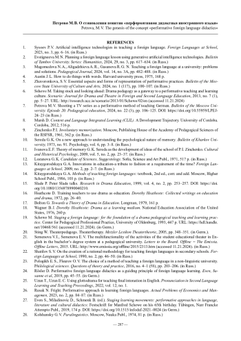 1. Сысоев П.В. Технологии искусственного интеллекта в обучении иностранному языку // Иностранные языки в школе. 2023. № 3. С. 6-16.