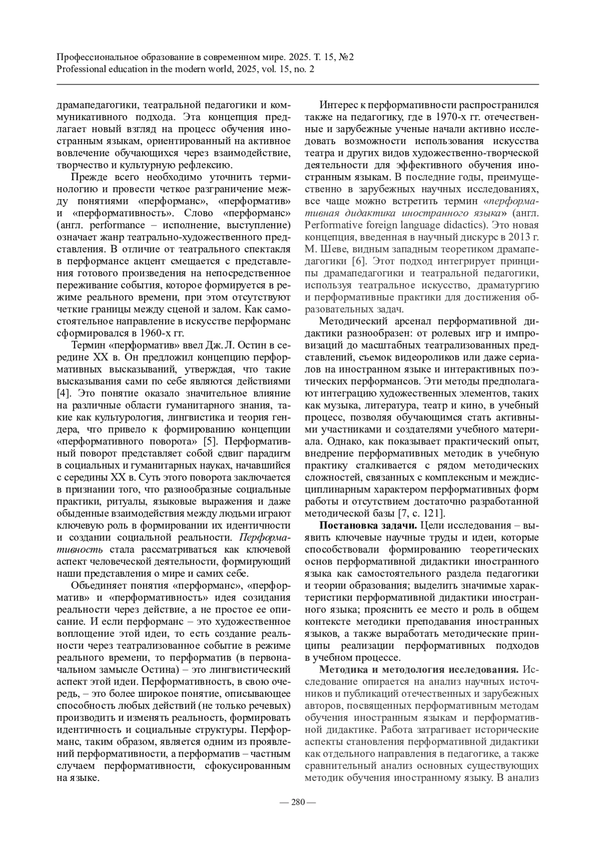Введение. Развитие педагогики требует постоянного обновления и пересмотра существующих методик. Введенный в 2013 г. М. Шеве термин «перформативная дидактика иностранного языка» отражает растущий интерес педагогического сообщества к использованию театрального искусства и других видов художественно-творческой деятельности в обучении иностранным языкам. Однако практическое применение перформативных методик сталкивается с трудностями, связанными с междисциплинарным характером и недостаточной методической базой.