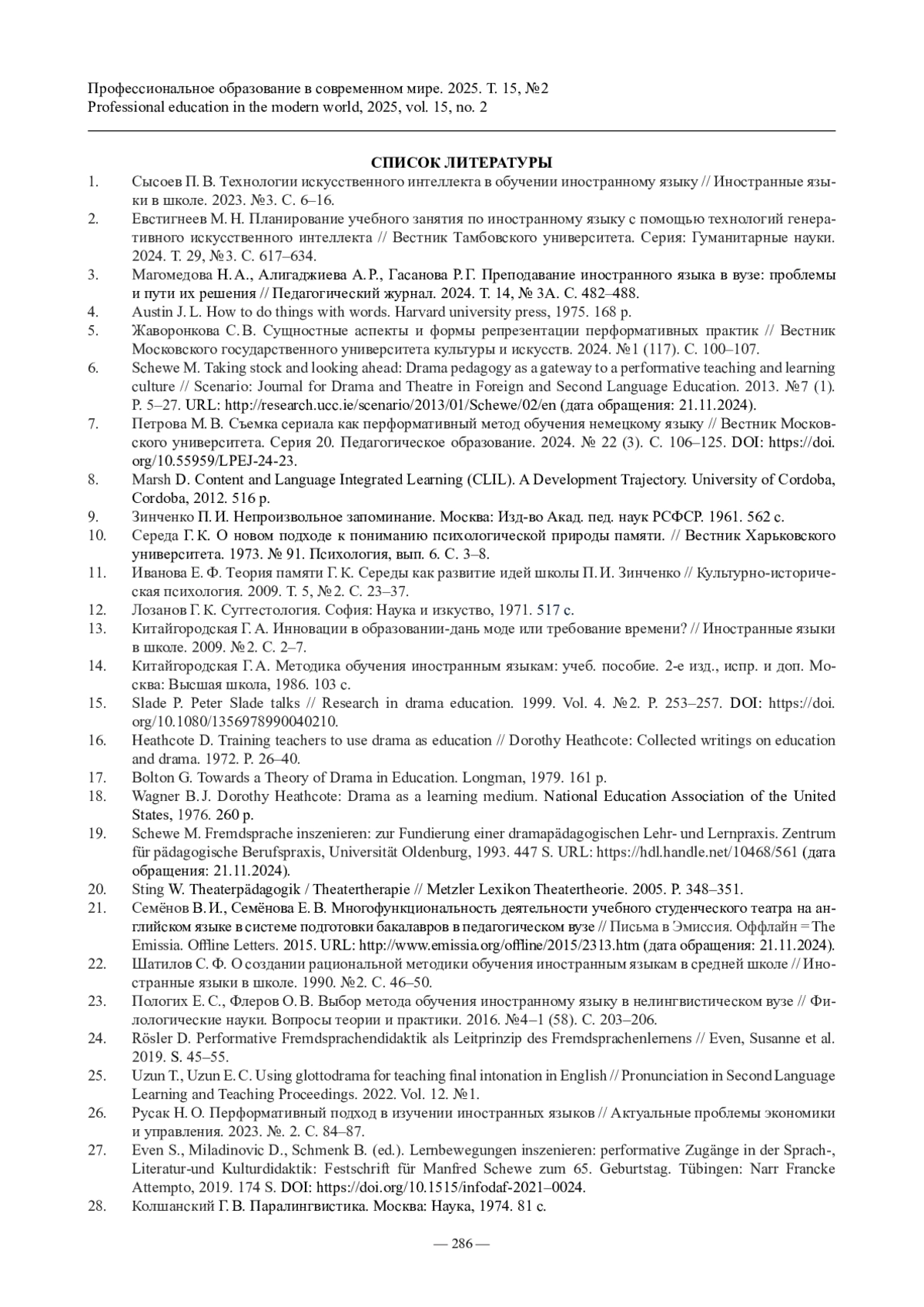 6. Sсhewe M. Taking stock and looking ahead: Drama pedagogy as a gateway to a performative teaching and learning culture // Scenario: Journal for Drama and Theatre in Foreign and Second Language Education. 2013. № 7 (1). P. 5-27. URL: http://research.ucc.ie/scenario/2013/01/Schewe/02/en (дата обращения: 21.11.2024).