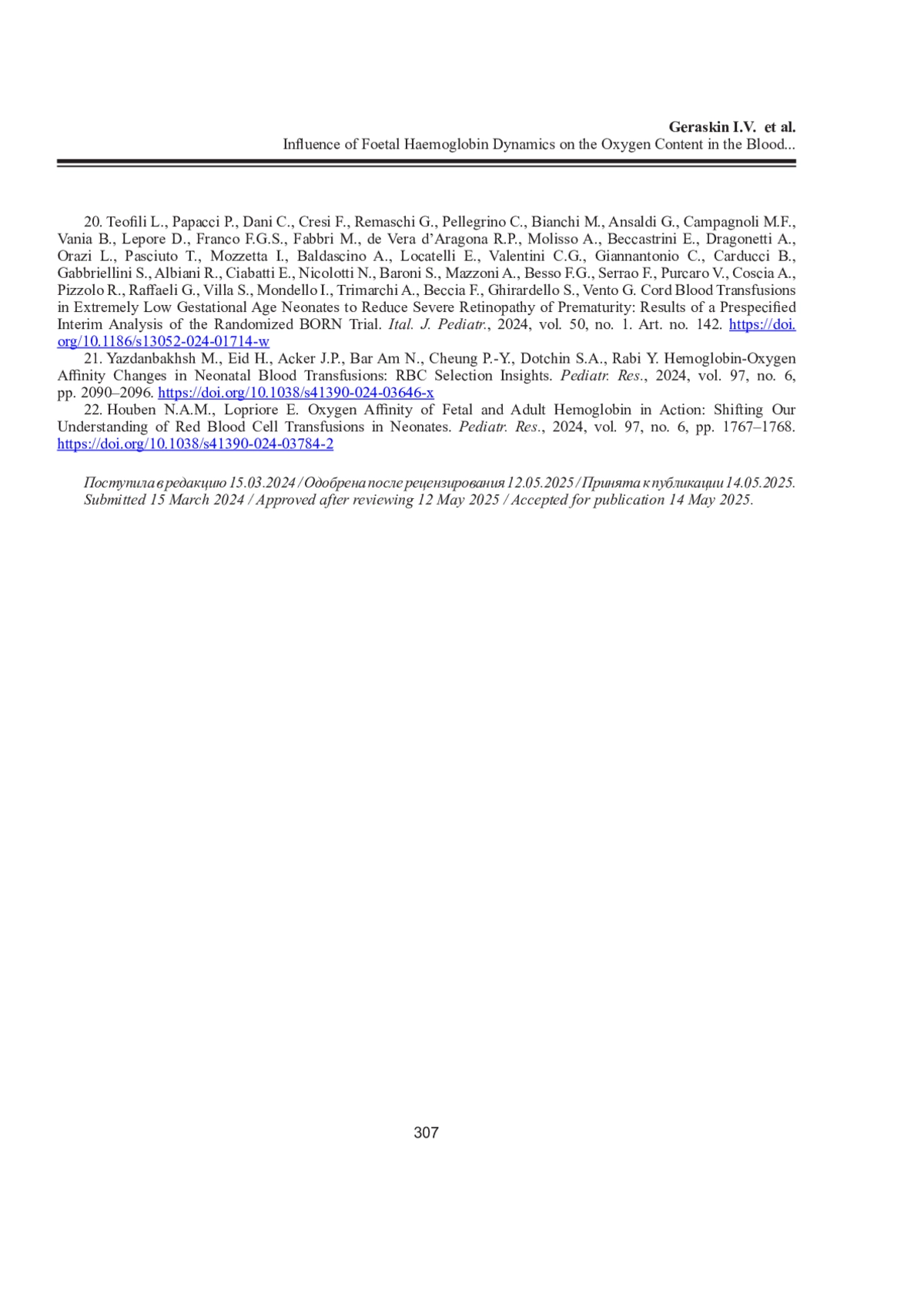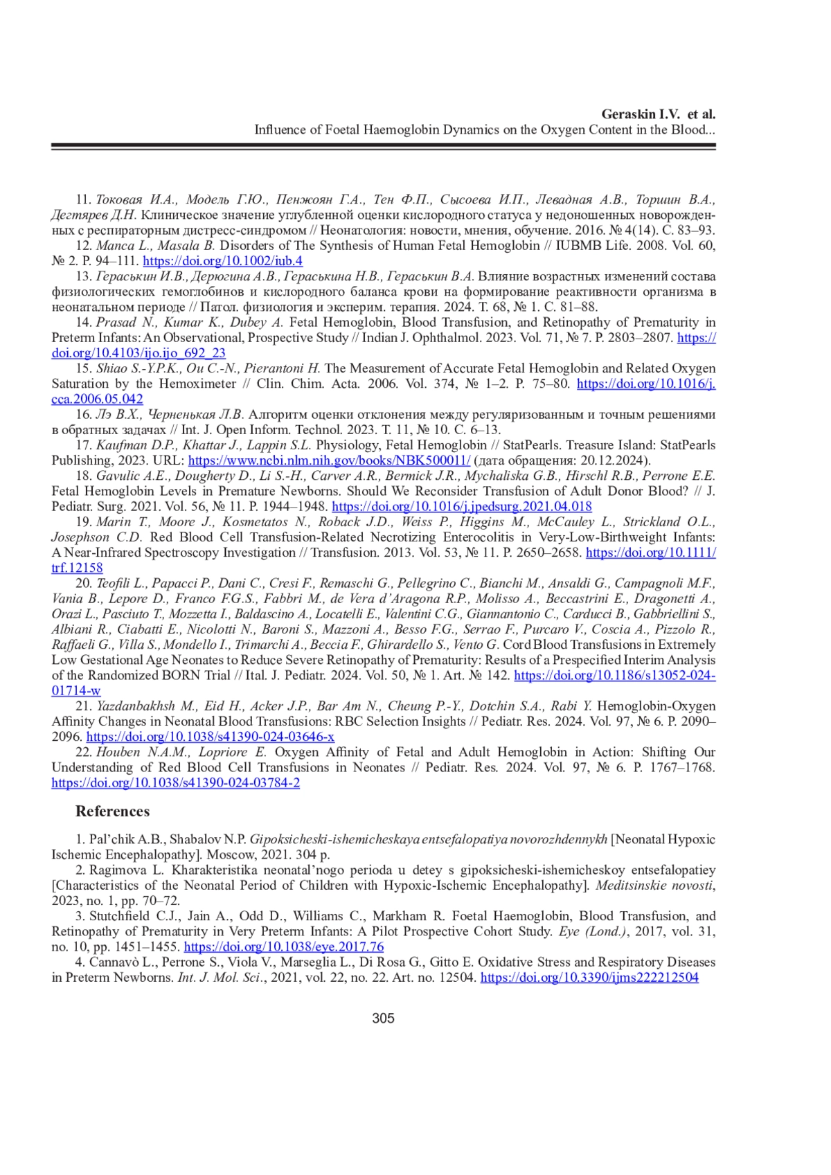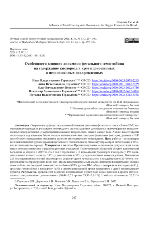 ГЕРАСЬКИН И. В., ДЕРЮГИНА А. В., ВОЕННОВ О. В., ГЕРАСЬКИН В. А., ГЕРАСЬКИНА Н. В. ОСОБЕННОСТИ ВЛИЯНИЯ ДИНАМИКИ ФЕТАЛЬНОГО ГЕМОГЛОБИНА НА СОДЕРЖАНИЕ КИСЛОРОДА В КРОВИ ДОНОШЕННЫХ И НЕДОНОШЕННЫХ НОВОРОЖДЕННЫХ // ЖУРНАЛ МЕДИКО-БИОЛОГИЧЕСКИХ ИССЛЕДОВАНИЙ. 2025. Т. 13 № 3