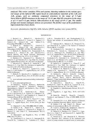 - Bovina L. A., Boltar K. O., Iakovleva N. I., Burlakov I. D., Golovin S. V., Ivanov V. I., Saginov V. I., Stafeev L. D., Akimov V. M., Sidorov Y. G. / Proceeding SPIE. 2000. Vol. 4340. P. 23–26.