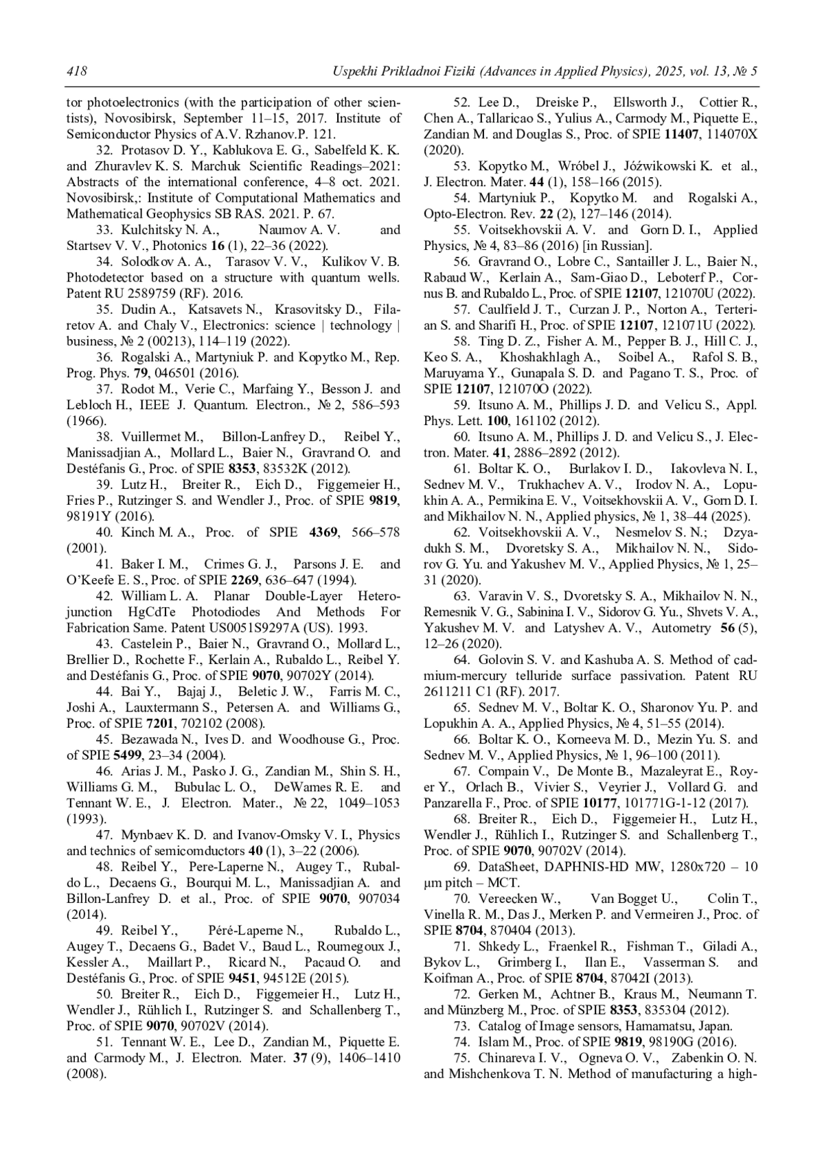 35. Дудин А., Кацавец Н., Красовицкий Д., Фила-ретов А., Чалый В. / Электроника: наука | технология | бизнес. 2022. № 2 (00213). С. 114–119. - Rogalski A., Martyniuk P., Kopytko M. / Rep. Prog. Phys. 2016. Vol. 79. P. 046501.