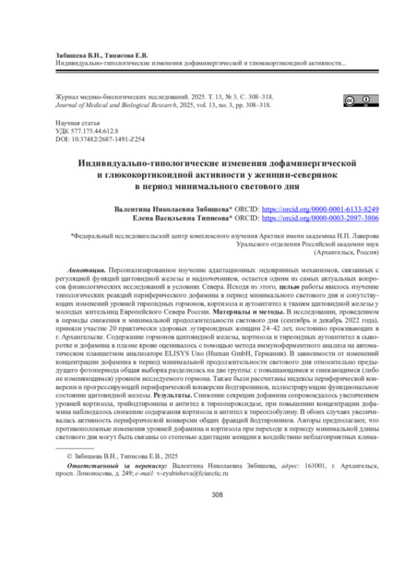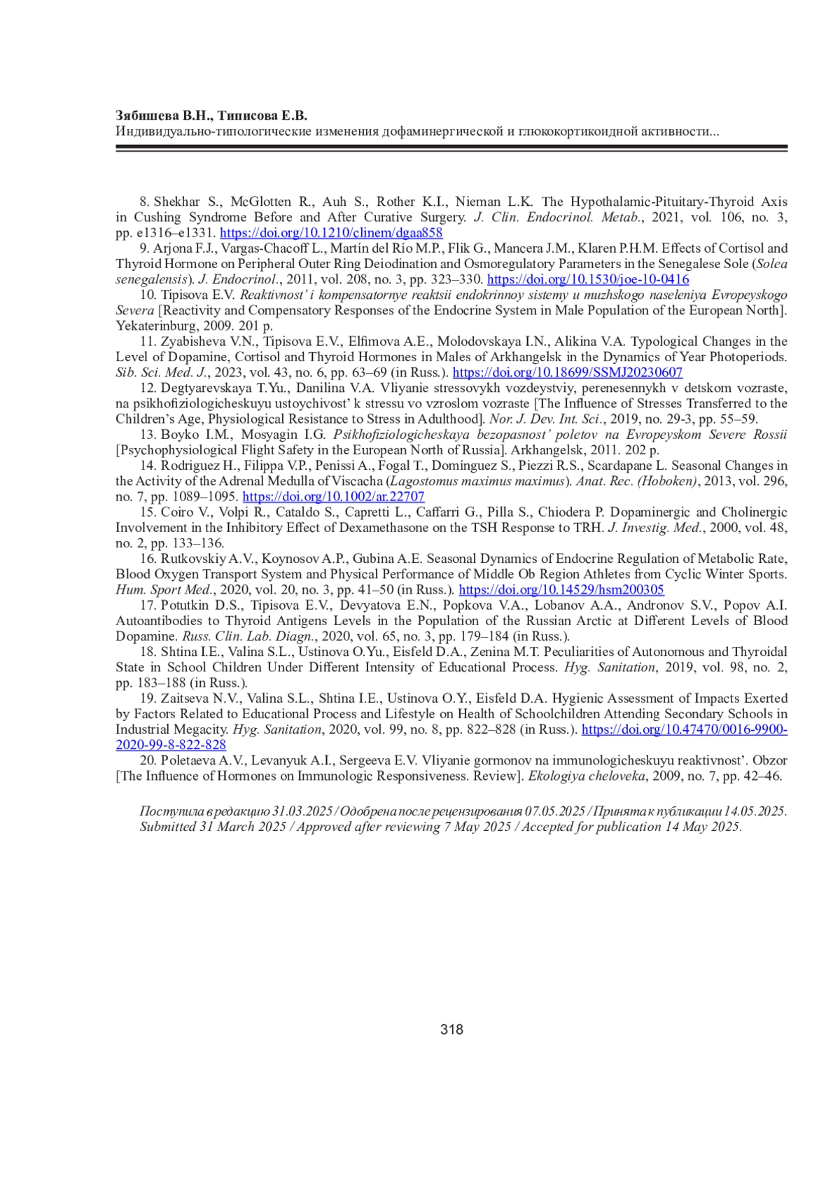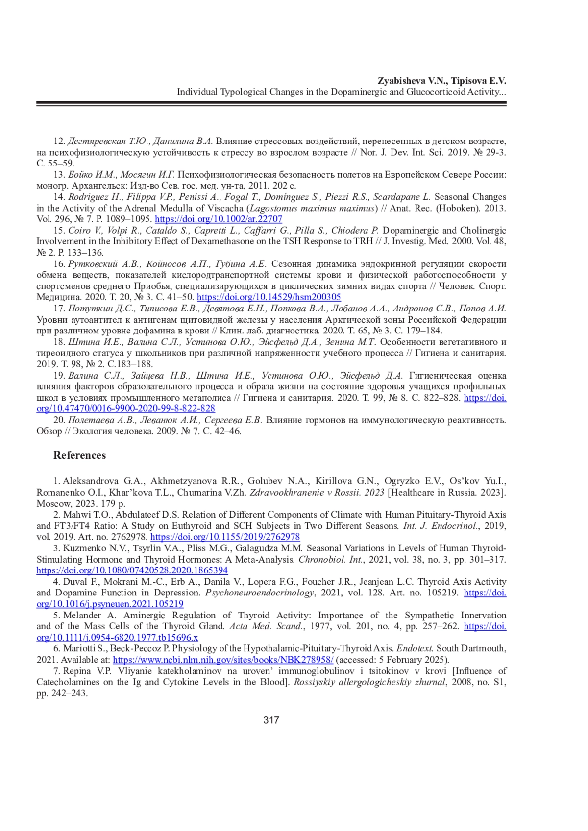 11. Зябишева В.Н., Типисова Е.В., Елфимова А.Э., Молодовская И.Н., Аликина В.А. Типологические изменения уровня дофамина, кортизола и тиреоидных гормонов у мужчин г. Архангельска в динамике фотопериодов года // Сиб. науч. мед. журн. 2023. Т. 43, No 6. С. 63-69. DOI: 10.18699/SSMJ20230607 EDN: HPENZR