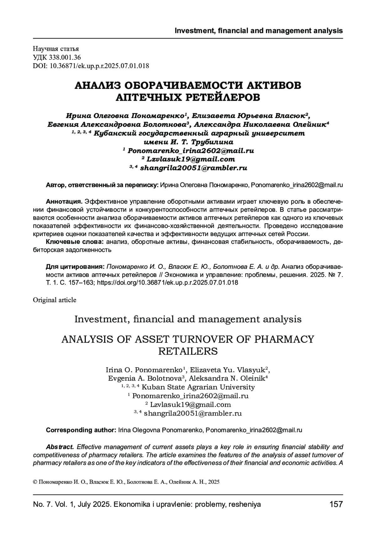 Эффективное управление оборотными активами играет ключевую роль в обеспечении финансовой устойчивости и конкурентоспособности аптечных ретейлеров. В статье рассматриваются особенности анализа оборачиваемости активов аптечных ретейлеров как одного из ключевых показателей эффективности их финансово-хозяйственной деятельности. Проведено исследование критериев оценки показателей качества и эффективности ведущих аптечных сетей России.