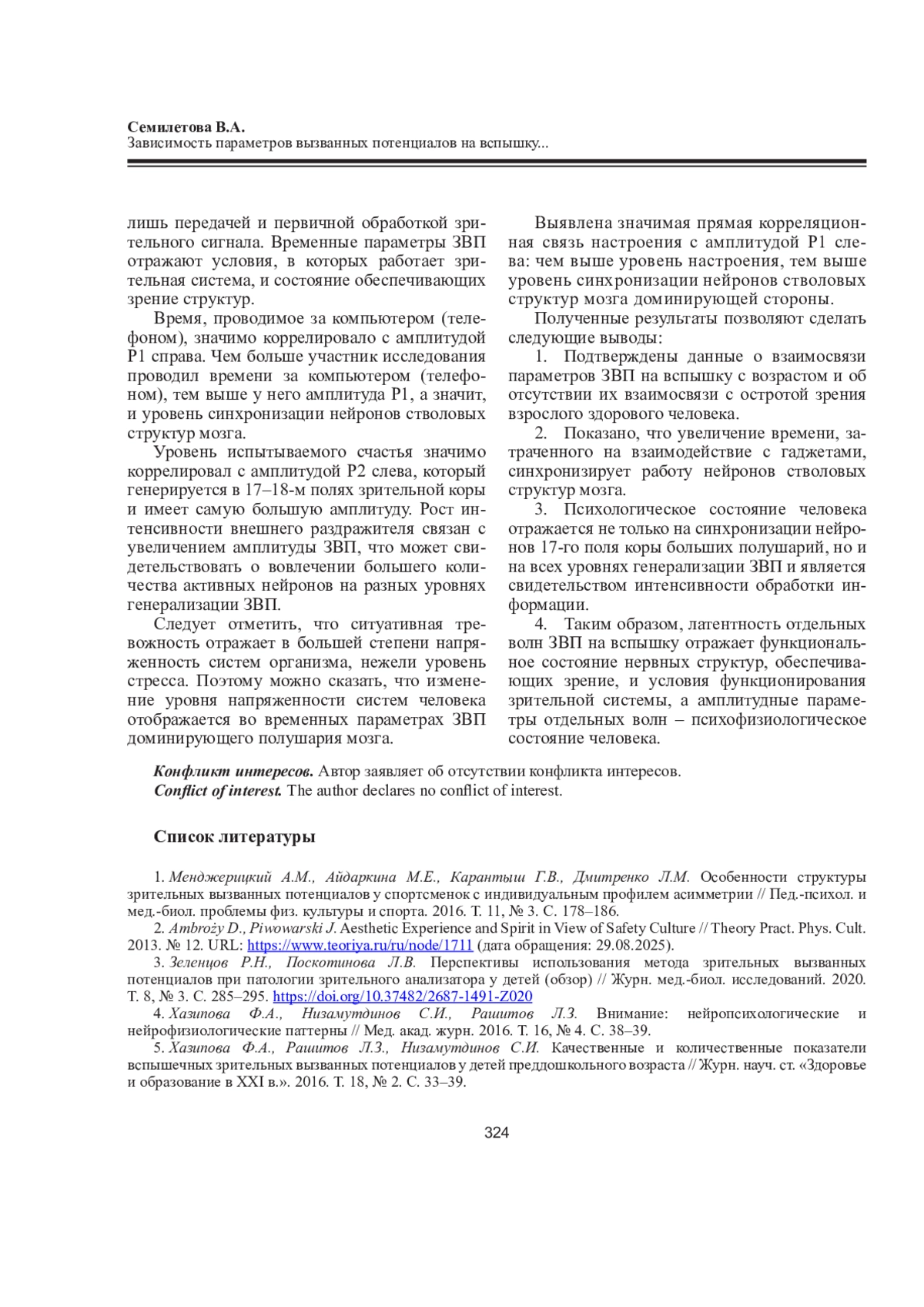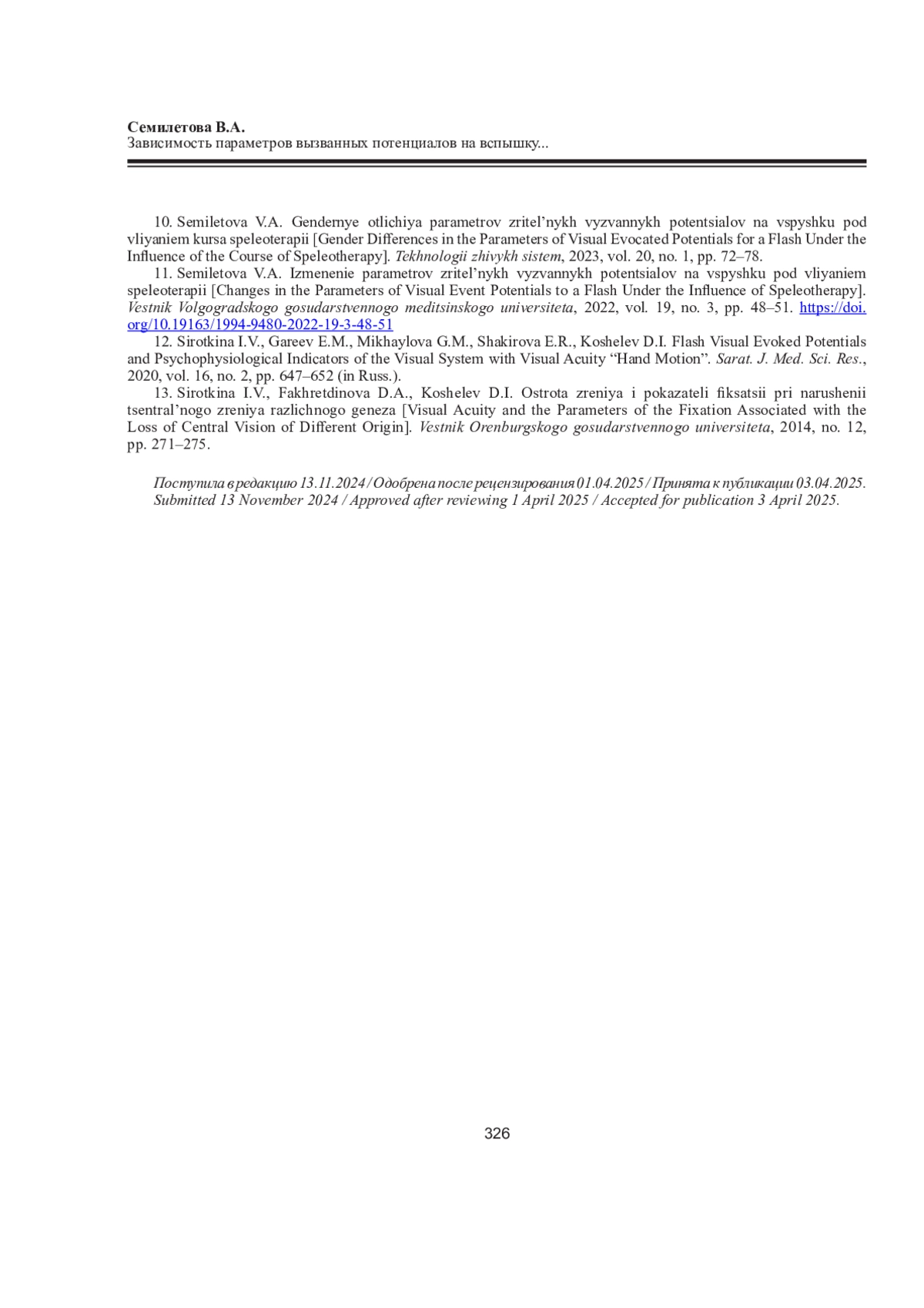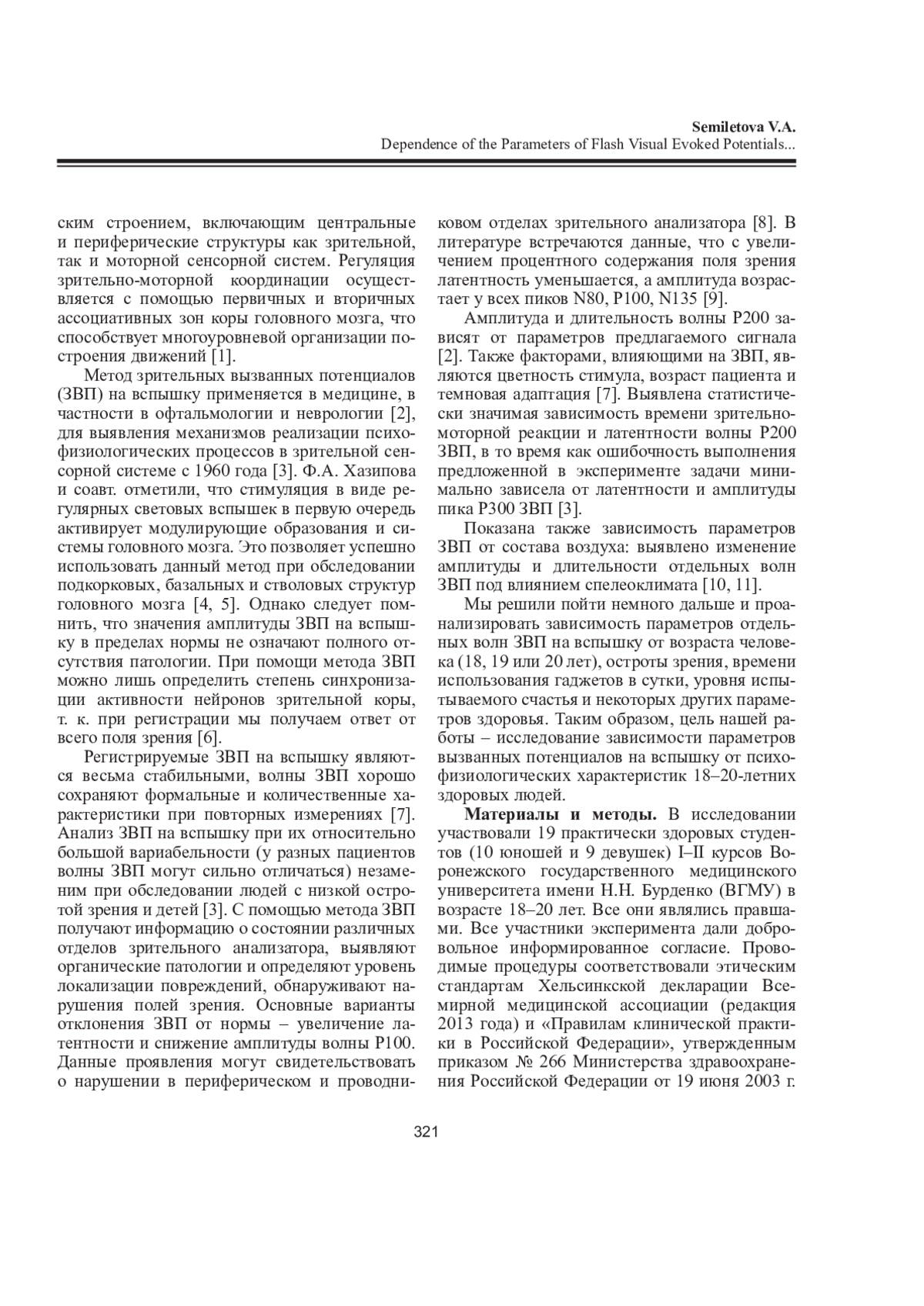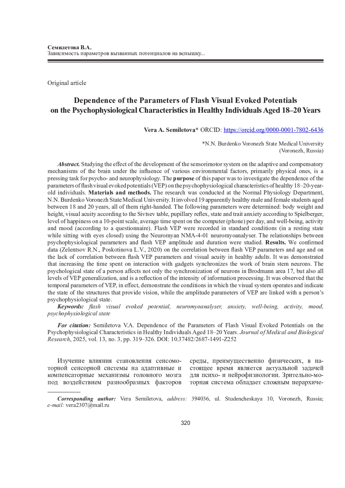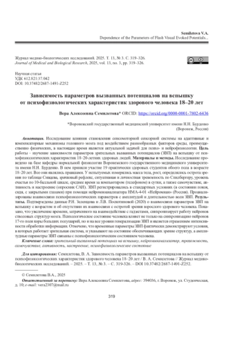 СЕМИЛЕТОВА В. А. ЗАВИСИМОСТЬ ПАРАМЕТРОВ ВЫЗВАННЫХ ПОТЕНЦИАЛОВ НА ВСПЫШКУ ОТ ПСИХОФИЗИОЛОГИЧЕСКИХ ХАРАКТЕРИСТИК ЗДОРОВОГО ЧЕЛОВЕКА 18-20 ЛЕТ // ЖУРНАЛ МЕДИКО-БИОЛОГИЧЕСКИХ ИССЛЕДОВАНИЙ. 2025. Т. 13 № 3