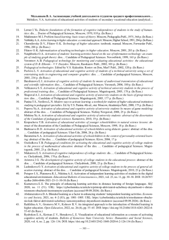 40. Потапов И.С., Платонова Р.И., Никитина А.Е. Активизация самостоятельной учебной деятельности студентов в цифровой образовательной среде // Образовательный вестник «Сознание». 2021. T. 23, № 11. С. 30-38. https://doi.org/10.26787/nydha-2686-6846-2021-23-11-30-38