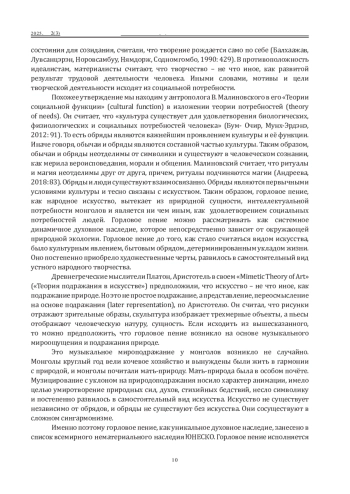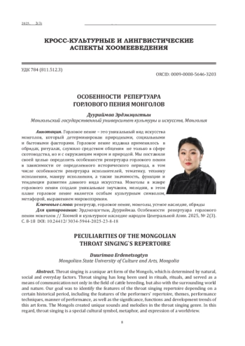 Горловое пение – это уникальный вид искусства монголов, который детерминирован природными, социальными и бытовыми факторами. Горловое пение издавна применялось в обрядах, ритуалах, служило средством общения не только в сфере скотоводства, но и с окружаящим миром и природой. Мы поставили своей целью определить особенности репертуара горлового пения в зависимости от определенного исторического периода, в том числе особенности репертуара исполнителей, тематику, технику исполнения, манеру исполнения, а также значимость, функции и тенденции развития данного вида искусства. Монголы в жанре горлового пения создали уникальные звучания, мелодии, в этом плане горловое пение является особым культурным символом, метафорой, выражением мировоззрения.