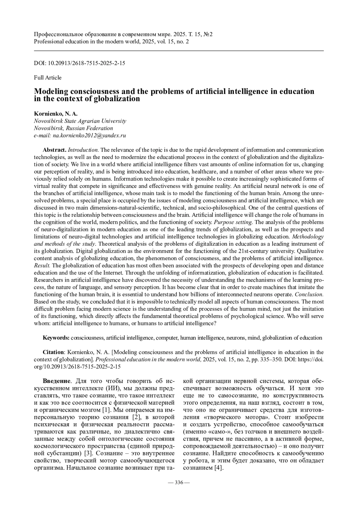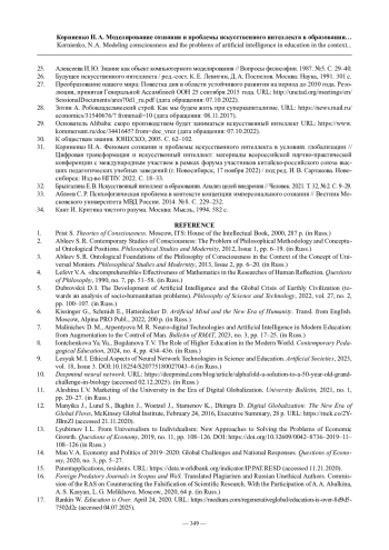 31. Корниенко Н.А. Феномен сознания и проблемы искусственного интеллекта в условиях глобализации // Цифровая трансформация и искусственный интеллект: материалы всероссийской научно-практической конференции с международным участием в рамках форума участников китайско-российского союза высших педагогических учебных заведений (г. Новосибирск, 17 ноября 2022) / под ред. И.В. Сартакова. Новосибирск: Изд-во НГПУ. 2022. С. 18-33.