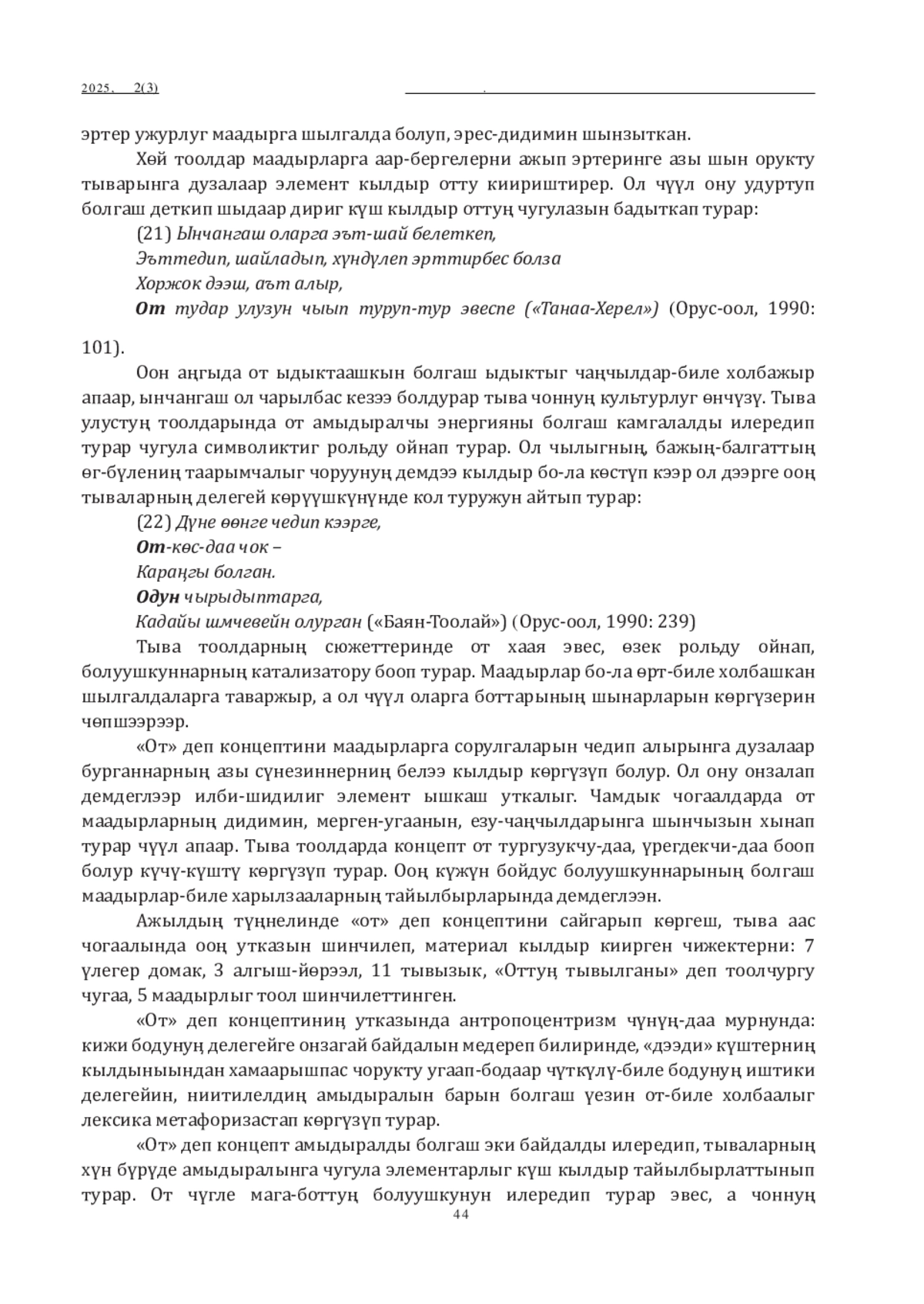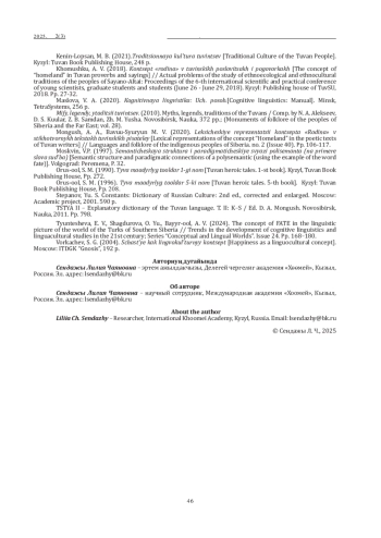 14. Монгуш А. А., Бавуу-Сюрюн М. В. Лексические репрезентации концепта “Родина” в стихотворных текстах тувинских писателей // Языки и фольклор коренных народов Сибири. 2020. № 2 (Вып. 40). С. 106-117.