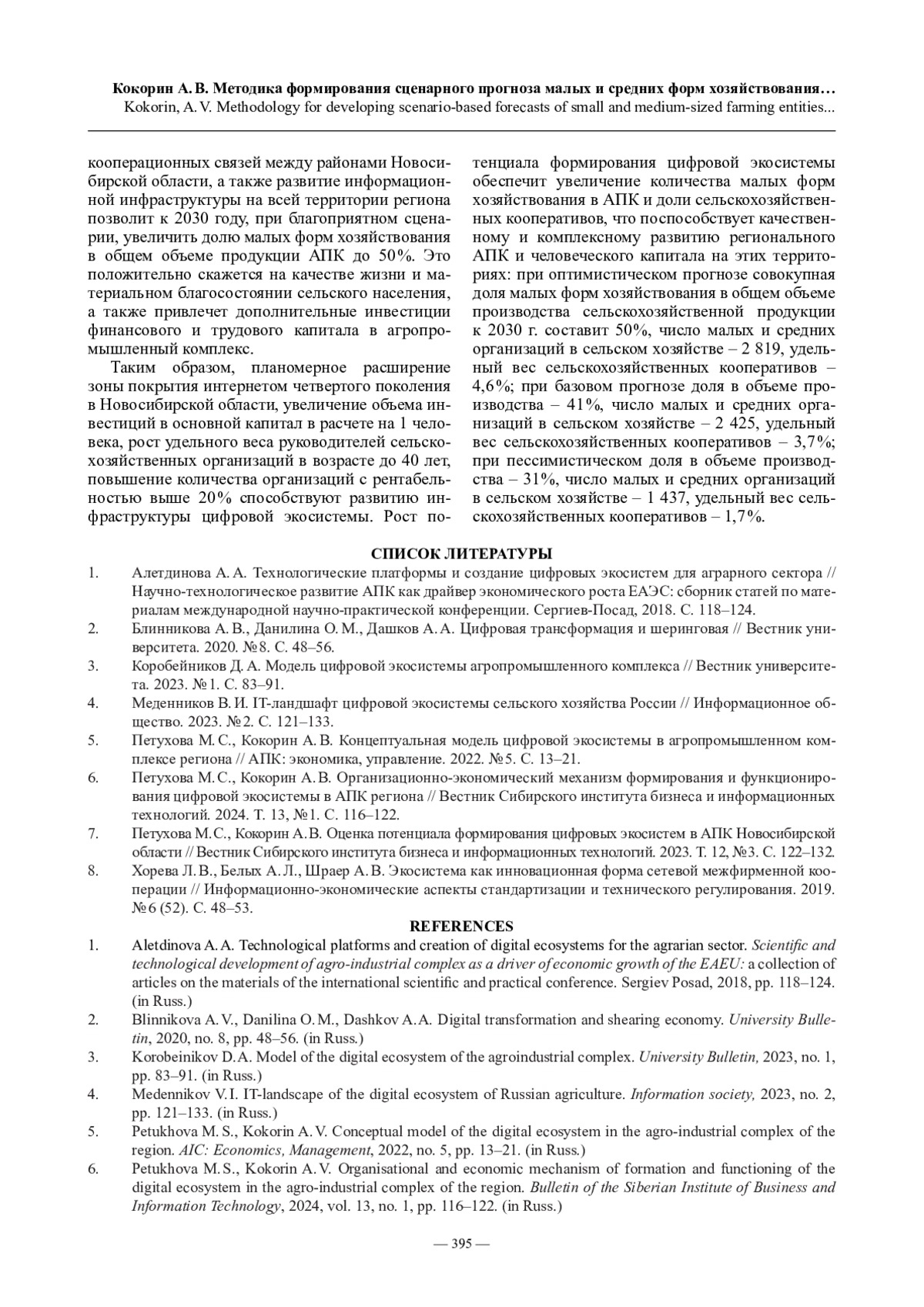 6. Петухова М.С., Кокорин А.В. Организационно-экономический механизм формирования и функционирования цифровой экосистемы в АПК региона // Вестник Сибирского института бизнеса и информационных технологий. 2024. Т. 13, № 1. С. 116-122.