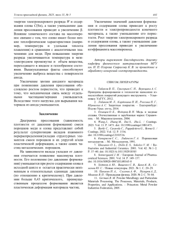 The density, porosity, electrical conductivity, and mass transfer coefficient (during electric spark treatment) of powdered electrode materials of the coppertin system have been determined. They were obtained by cold one-sided molding of a mixture of metal powders in a closed mold. The “density – pressing pressure” diagram is a superposition of the mutual redistribution/stacking of the structural elements of the powder material and their elas-tic/plastic deformation. The critical molding pressures are determined (when describing the diagram as a logarithmic function). Depending on the pressure of the installation con-tribution, there is a maximum. It shifts to the region of low forming pressures with an increase in the tin content in the initial charge. In relative units of pressure (relative to criti-cal), its position remains practically unchanged. An increase in the molding pressure and tin content leads to an increase in the density and electrical conductivity of the final material, as well as a decrease in its porosity. An increase in the energy of the electric spark discharge and tin content, as well as a decrease in the pressing pressure, lead to an increase in the mass transfer coefficient.