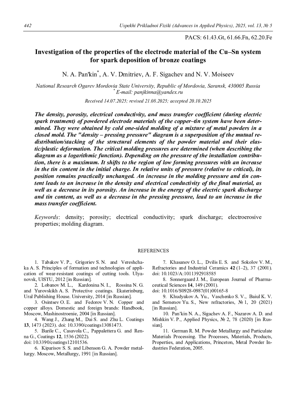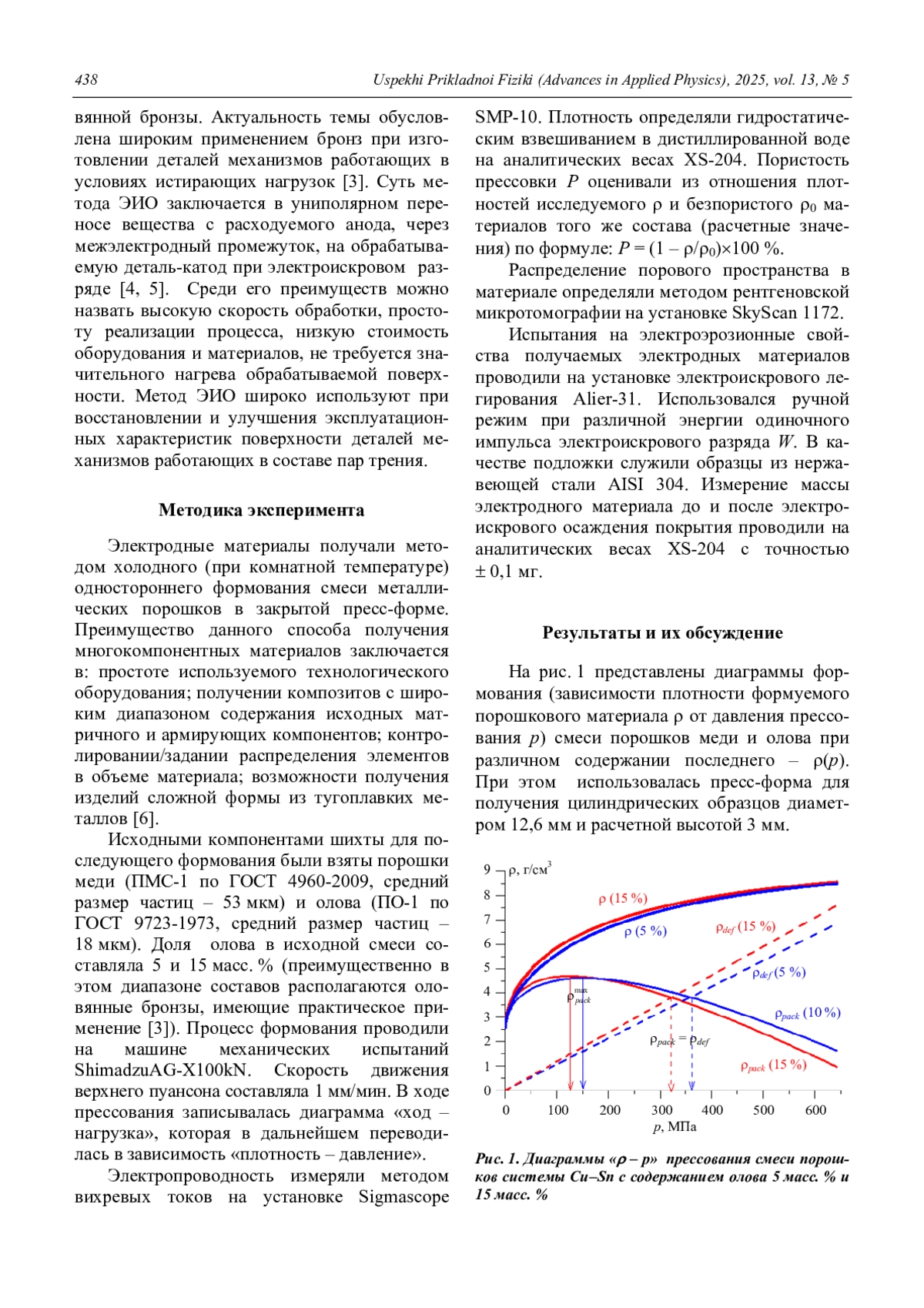 Определены плотность, пористость, электропроводность и коэффициент массопереноса (при электроискровой обработке) порошковых электродных материалов системы «медь – олово». Они были получены методом холодного одностороннего формования смеси порошков металлов в закрытой пресс-форме. Диаграмма «плотность – давление прессования» является суперпозицией взаимного перераспределения/укладки структурных элементов порошкового материала и их упругой/пластической деформации. Определены критические давления формования (при аппроксимации логарифмической функцией). На зависимости от давления вклада укладки имеется максимум. Он смещается в область малых давлений формования при росте содержания олова в исходной шихте. В относительных единицах давления (по отношению к критическому) его положение остается практически неизменным. Увеличение давления формования и содержания олова приводит к росту плотности и электропроводности конечного материала, а также уменьшению его пористости. Рост энергии электроискрового разряда и содержания олова, а также уменьшение давления прессования приводят к увеличению коэффициента массопереноса.