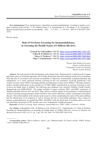 Ранний период развития организма, характеризующийся быстрым ростом органов и тканей, крайне важен для здоровья человека. Изучение врожденных ошибок иммунитета (ВОИ), которые могут быть связаны с повышенной восприимчивостью к инфекциям, аутоиммунитету, лимфопролиферации и злокачественным новообразованиям, привело к созданию программы расширенного скрининга новорожденных на ВОИ путем количественной оценки кругов эксцизии рецепторов Т-клеток (TREC) и кругов эксцизии делеции-рекомбинации каппа (KREC). Цель работы - анализ научных публикаций, посвященных использованию определения уровней TREC и KREC в рамках неонатального скрининга для оценки состояния здоровья детей. Поиск осуществлялся в открытых базах данных PubMed, Google Scholar, SpringerLink и eLIBRARY. RU. В выборку включены 53 работы за период с 2016 по 2024 год, посвященные исследованию показателей TREC и KREC у детей. Установлено, что многие авторы обнаруживали изменения показателей иммунологического неонатального скрининга у детей с недоношенностью, а также с различными инфекционными, соматическими, аутоиммунными и генетическими патологиями. Данные отклонения в иммунной системе могут являться фактором, осложняющим течение основного заболевания и снижающим эффективность его лечения, а также увеличивать риски формирования сопутствующей патологии. Таким образом, тестирование на первичные иммунодефициты методом количественной оценки TREC и KREC в сухих пятнах крови новорожденных позволяет не только формировать группы риска по развитию ВОИ, но и дать более углубленную оценку состояния здоровья.