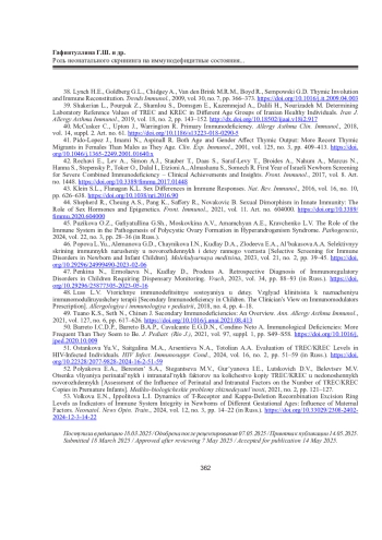 41. Pido-Lopez J., Imami N., Aspinall R. Both Age and Gender Affect Thymic Output: More Recent Thymic Migrants in Females Than Males as They Age // Clin. Exp. Immunol. 2001. Vol. 125, No 3. P. 409-413. DOI: 10.1046/j.1365-2249.2001.01640.x EDN: BADJQZ