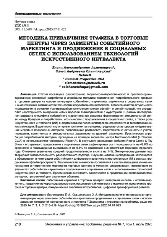 Статья посвящена рассмотрению теоретико-методологических и практико-ориентированных оснований разработки и апробации методики привлечения потребительского трафика в торговые центры на основе интеграции событийного маркетинга, маркетинга в социальных сетях и аналитических возможностей технологий искусственного интеллекта. Обосновывается актуальность исследования в условиях усиливающейся конкуренции между офлайн- и онлайн-средой, что определяет необходимость внедрения новых моделей взаимодействия с аудиторией. В рамках исследования раскрыта специфика событийного маркетинга как средства формирования эмоциональной связи между брендом и потребителем, его синергии с продвижением в социальных сетях, а также роль искусственного интеллекта (ИИ) в формировании персонализированного контента и таргетированной коммуникации. Выделяются структурные компоненты методики, предлагается авторская концептуальная модель и процессный алгоритм, позволяющие реализовать маркетинговые активности с учетом поведения, когнитивных и эмоциональных характеристик целевой аудитории. Практическая апробация разработанной методики проведена на примере торгового центра Northwoods Mall (г. Пеория, США) с использованием платформы Placer AI. В результате реализации события Peoria Comic & Toy Show и его целевого продвижения в социальных сетях зафиксирован рост посещаемости на 42,8% по сравнению с предыдущими выходными и на 6,8% по сравнению с аналогичным периодом прошлого года. Отмечено увеличение средней продолжительности визита на 14%. Эмпирические данные подтверждают жизнеспособность разработанного подхода. Научная новизна исследования заключается в обосновании и интеграции событийного и цифрового маркетинга с инструментами ИИ в рамках продвижения офлайн-пространств. Теоретическая значимость проявляется в систематизации и уточнении принципов интегративного маркетинга торговых центров в условиях цифровизации, основанного на элементах событийного маркетинга и продвижения в социальных сетях с использованием технологий искусственного интеллекта. Практическая значимость заключается в предложении воспроизводимой методики, применимой для различных объектов.