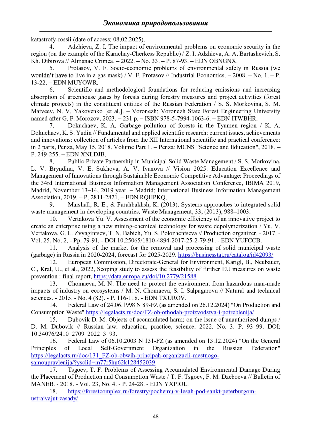 3. Соколов Ю. И. Риски мусорной экологической катастрофы России // Проблемы анализа риска. 2018. №2. URL: https://cyberleninka.ru/article/n/riski-musornoy-ekologicheskoy-katastrofy-rossii (дата обращения: 08.02.2025).
