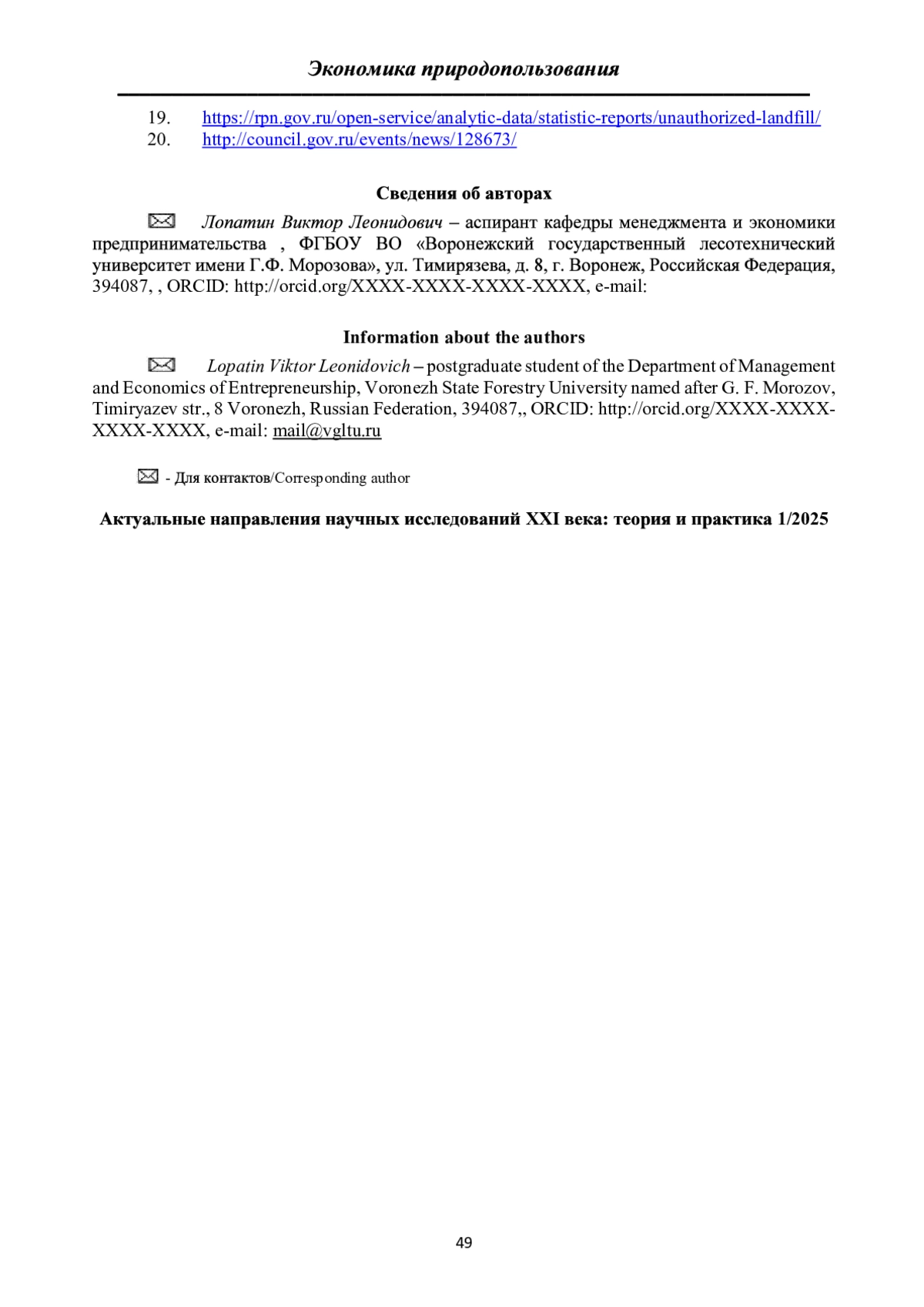 7. Докучаев, К. А. Загрязнение мусором лесов Тюменской области / К. А. Докучаев, К. С. Юдин // Фундаментальные и прикладные научные исследования: актуальные вопросы, достижения и инновации: сборник статей XII Международной научно-практической конференции: в 2 ч., Пенза, 15 мая 2018 года. Том Часть 1. - Пенза: МЦНС “Наука и Просвещение”, 2018. - С. 249-255. EDN: XNLDJB