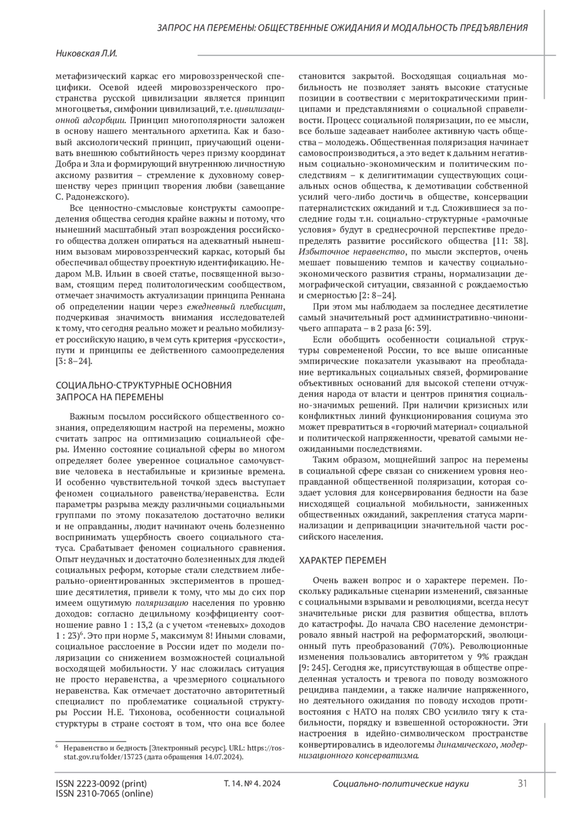 В статье анализируются результаты многолетних социологических исследований особенностей трансформации российского общества, связанные с растущим общественным запросом на перемены, модальность которого не снижается длительное время. Показано, что это обусловлено усилением социального активизма, связанного с «помогающим поведением», взаимопомощью и кооперацией. Это позволило прийти к пониманию, что административно-бюрократический класс выстроил для себя удобные «капсулы», блокирующие развитие естественной, с точки зрения здравого смысла, деловой и гражданской инициативы общества, позволяющей его членам участвовать в принятии социально-значимых решений. Общество настроено на оздоровление институциональной инфраструктуры общественного развития, прежде всего, снижение степени коррупции, отчуждения населения от власти, разблокировки каналов продвижения и реализации общественных интересов. Помимо этого, поднимается проблема недовольства людей растущей поляризацией социальных доходов, что снижает качество проводимой социальной политики в части улучшения демографических показателей, роста социальной восходящей мобильности на основе меритократических принципов, улучшения структуры социально-трудовой мотивации. Это обостряет чувство социальной справедливости, которое, будучи заблокированным, может привести к негативным социальным последствиям, формируя «горючий материал» и, соответственно, риски неконвенциональных социальных действий, связанных с социальными взрывами и революционными последствиями выражения недовольства Показано, что в настоящий момент большинство населения настроено на реформисткий лад, поскольку только освобождается от невротического синдрома после пандэмии короновируса и начала СВО. Определенный энергетический импульс к переменам задается также консолидированным общественным мнением, связанным с «перепрошивкой» российского общества по линии дифференциации от западных универсалистких подходов, поиска своего цивилизационно- культурного кода развития, возрождения неотрадиционалистских нарративов формирования ценностно-символического каркаса общественного сознания.