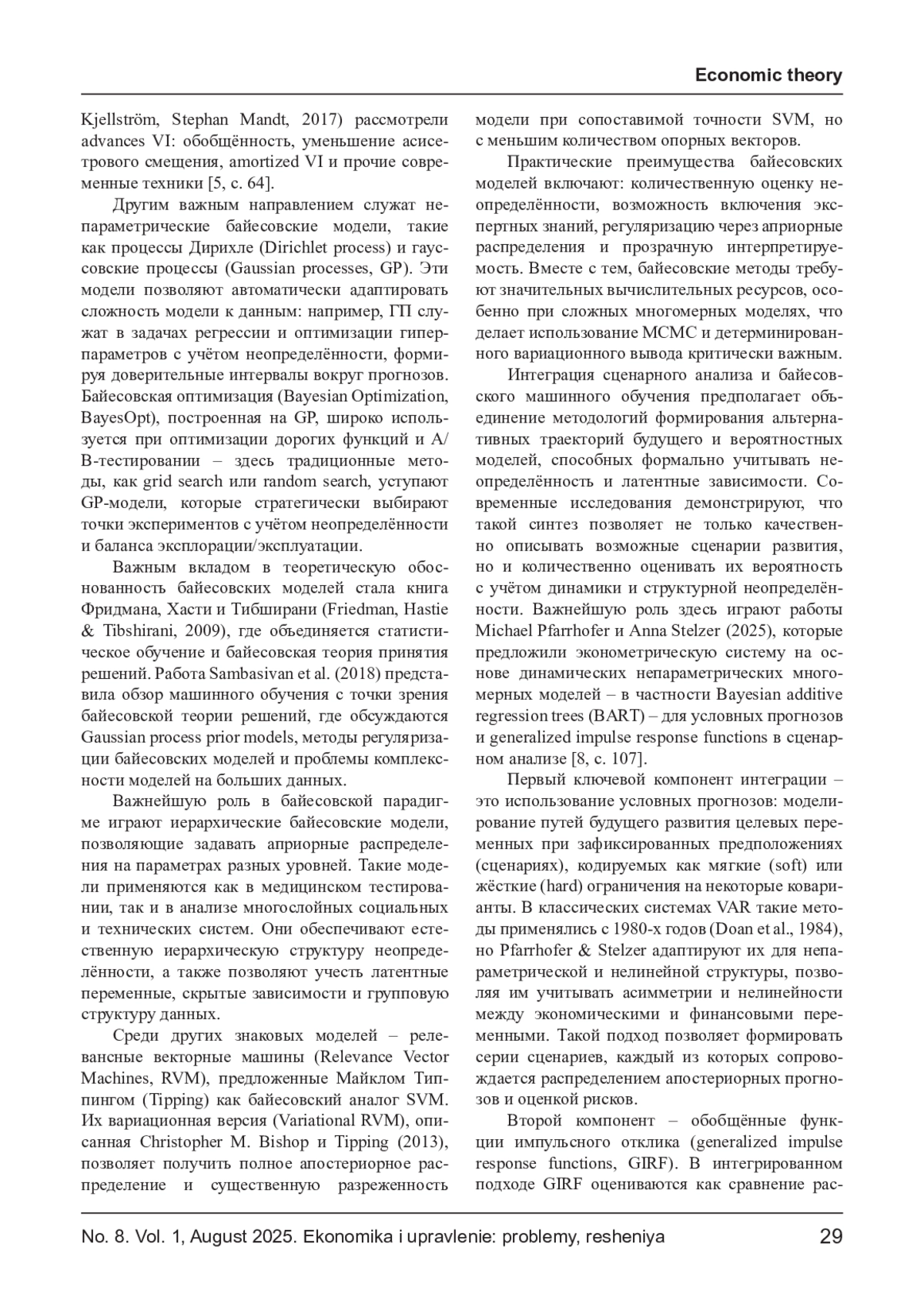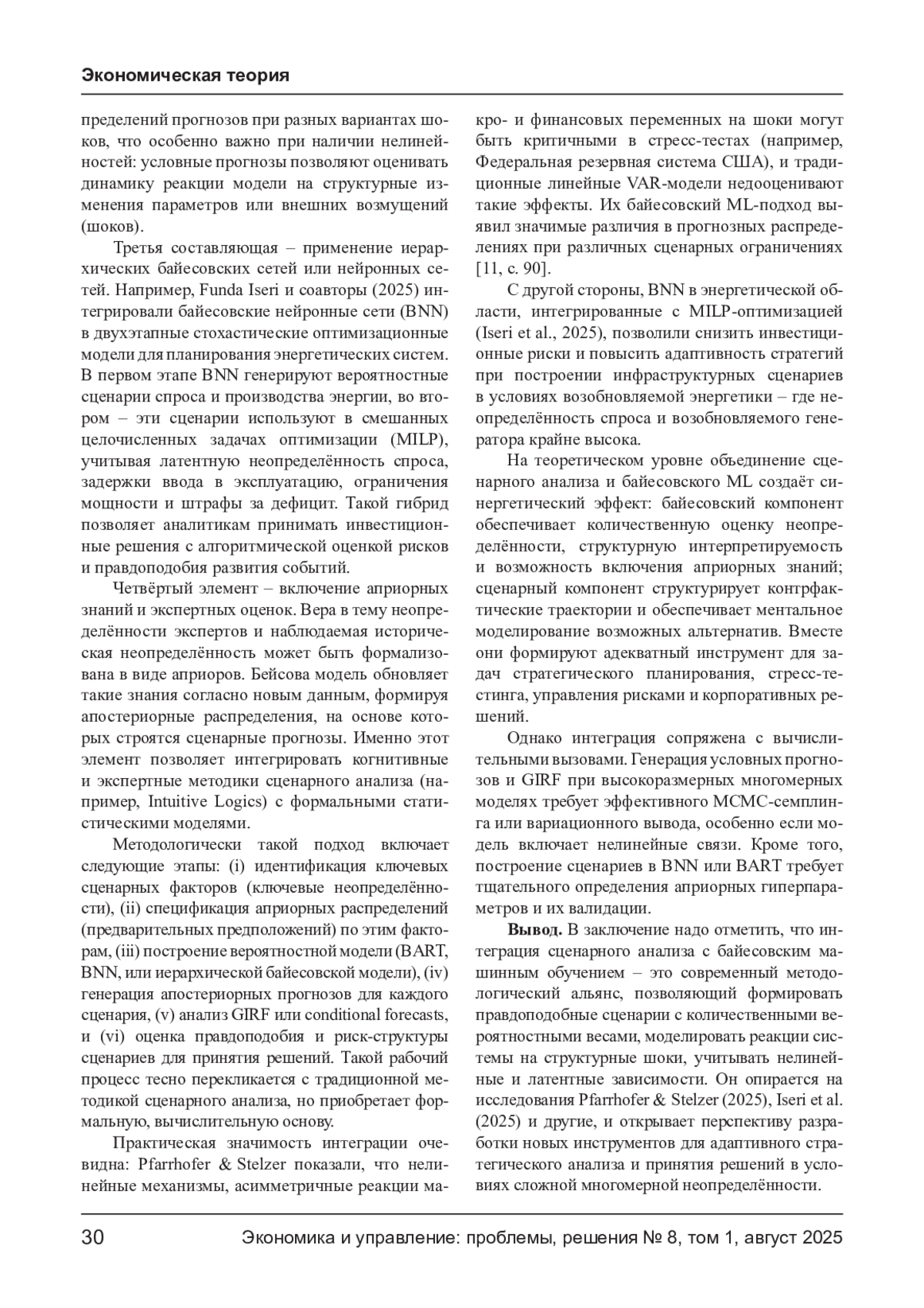 В статье рассматриваются теоретико-методологические основы интеграции сценарного анализа и многомерных байесовских моделей машинного обучения. Сценарный анализ представлен как инструмент стратегического планирования в условиях радикальной неопределённости, позволяющий формировать альтернативные траектории развития сложных систем. В свою очередь, байесовские модели в машинном обучении - в том числе Bayesian additive regression trees (BART), байесовские нейронные сети (BNN) и вариационные байесовские методы - обеспечивают формальное представление априорной неопределённости и латентной структуры данных. Особое внимание уделено методам построения условных прогнозов и обобщённых функций импульсного отклика (GIRF), адаптированным для нелинейных и непараметрических моделей. Обоснована практическая значимость данного подхода в макроэкономическом моделировании, энергетическом планировании и оценке инвестиционных рисков.