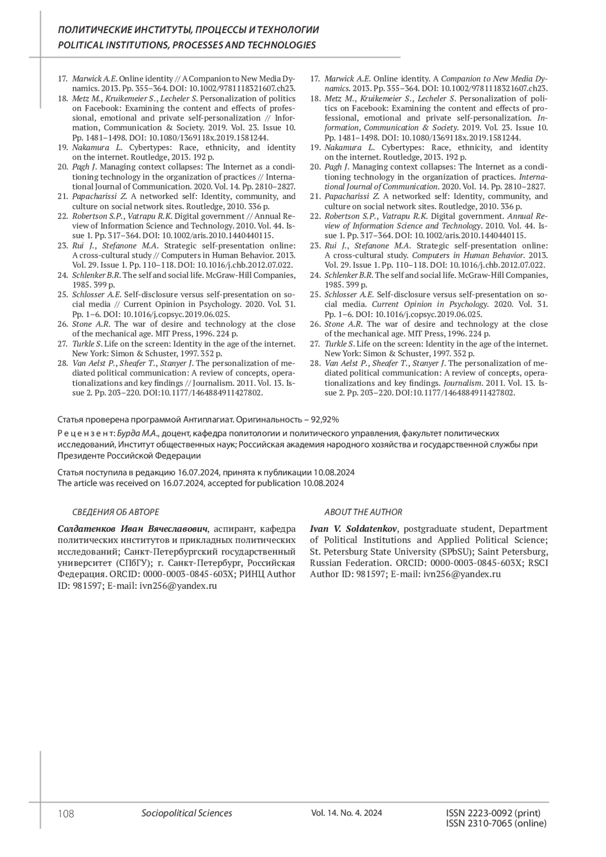 17. Marwick A.E. Online identity. A Companion to New Media Dynamics. 2013. Pp. 355-364. DOI: 10.1002/9781118321607.ch23