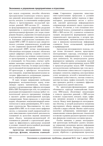 4. Николаев В. М., Смирнова Т. А. Архитектура интеграционных решений в цифровом строительстве // Вестник цифровой экономики. 2023. Т. 8, № 1. С. 65-74.