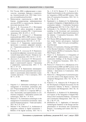 6. Данченок Л. А., Кулакова Е. Ю. Методологические аспекты интеграции цифровых платформ в строительной отрасли // Экономика и управление строительством. 2023. Т. 15, № 2. С. 97-110.