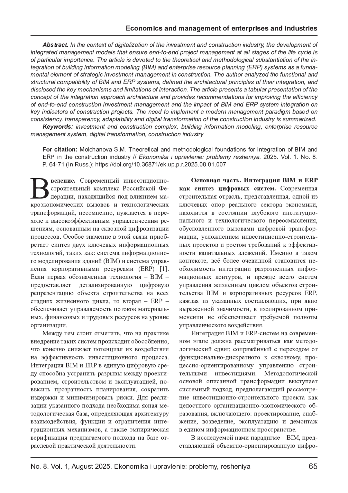 5. Баранов П. В., Иванова Е. С. Цифровая трансформация в строительной отрасли: интеграция BIM и ERP-систем // Вестник строительной экономики. 2022. Т. 12, № 3. С. 45-56.