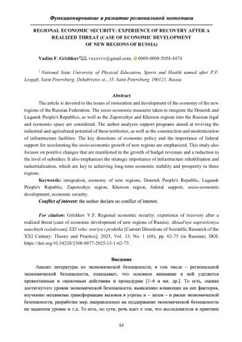 Статья посвящена вопросам восстановления и развития экономики «новых» регионов Российской Федерации. Рассматриваются социально-экономические меры, принимаемые для интеграции Донецкой и Луганской Народных Республик, а также Запорожской и Херсонской областей в российское правовое и экономическое пространство. Автор анализирует программы поддержки, направленные на возрождение промышленного и сельскохозяйственного потенциала этих территорий, а также строительство и модернизацию инфраструктурных объектов. Подчеркиваются ключевые направления экономической политики и значимость федеральной поддержки для ускорения социально-экономического роста «новых» регионов. Исследование акцентирует внимание на положительных изменениях, которые проявляются в росте бюджетных поступлений и сокращении уровня дотационности. Также подчеркивается стратегическая важность восстановления инфраструктуры и индустриализации, что является ключевым фактором для достижения долгосрочной экономической стабильности и процветания этих регионов.