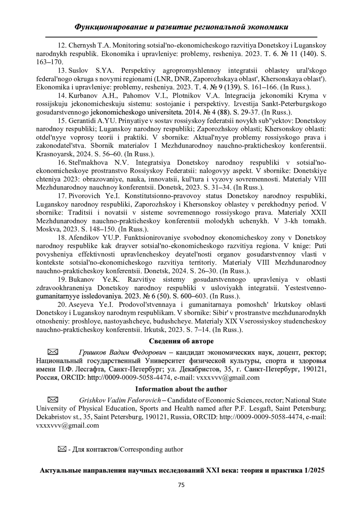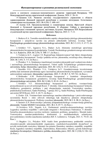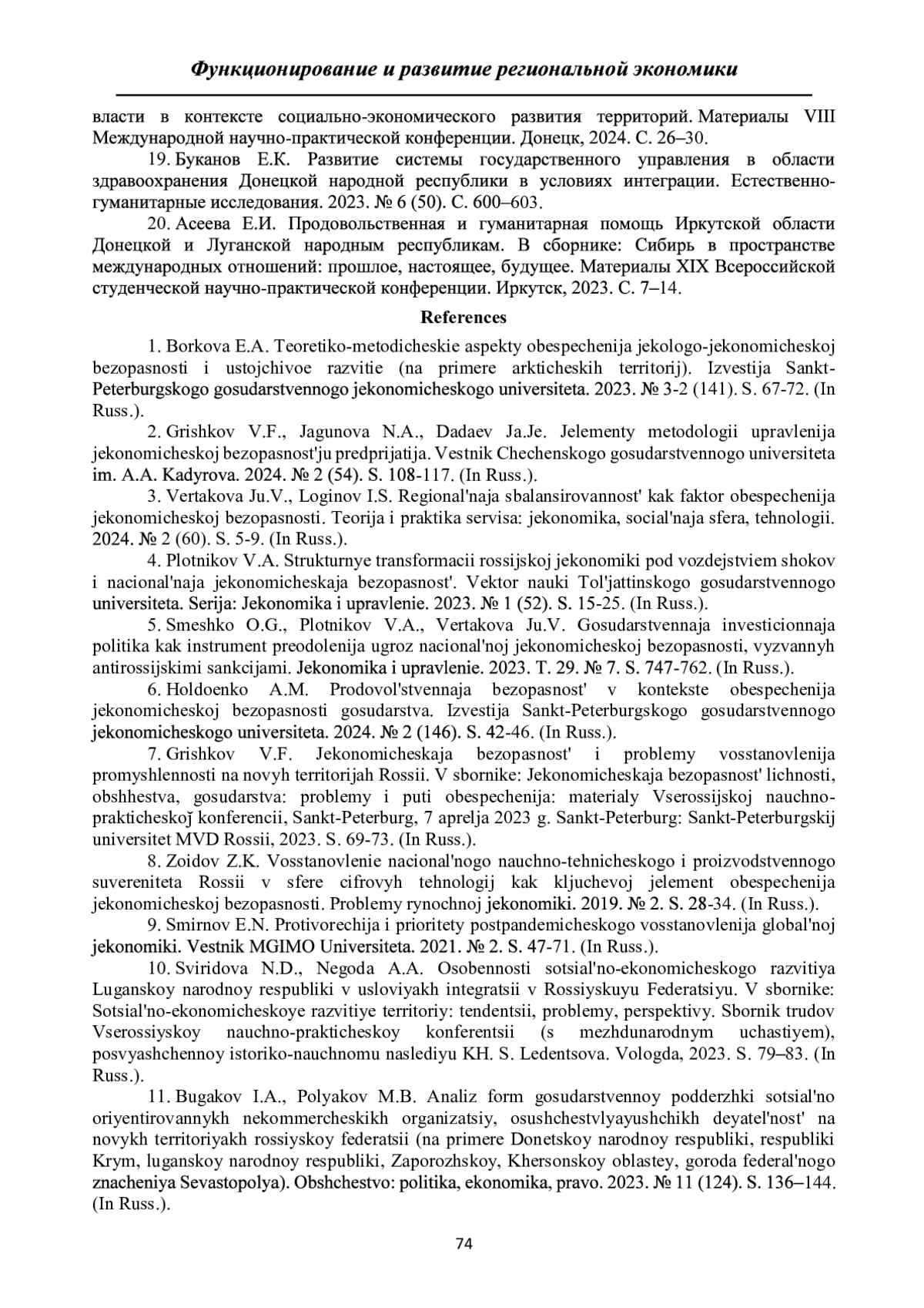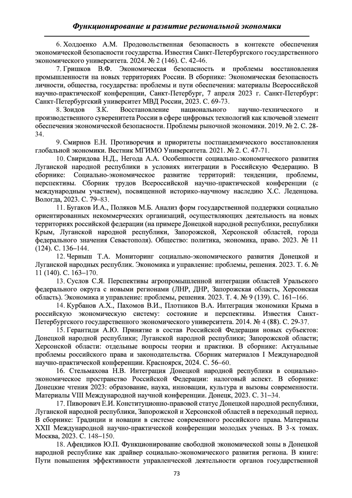 18. Афендиков Ю.П. Функционирование свободной экономической зоны в Донецкой народной республике как драйвер социально-экономического развития региона. В книге: Пути повышения эффективности управленческой деятельности органов государственной власти в контексте социально-экономического развития территорий. Материалы VIII Международной научно-практической конференции. Донецк, 2024. С. 26-30. EDN: NFSHWC