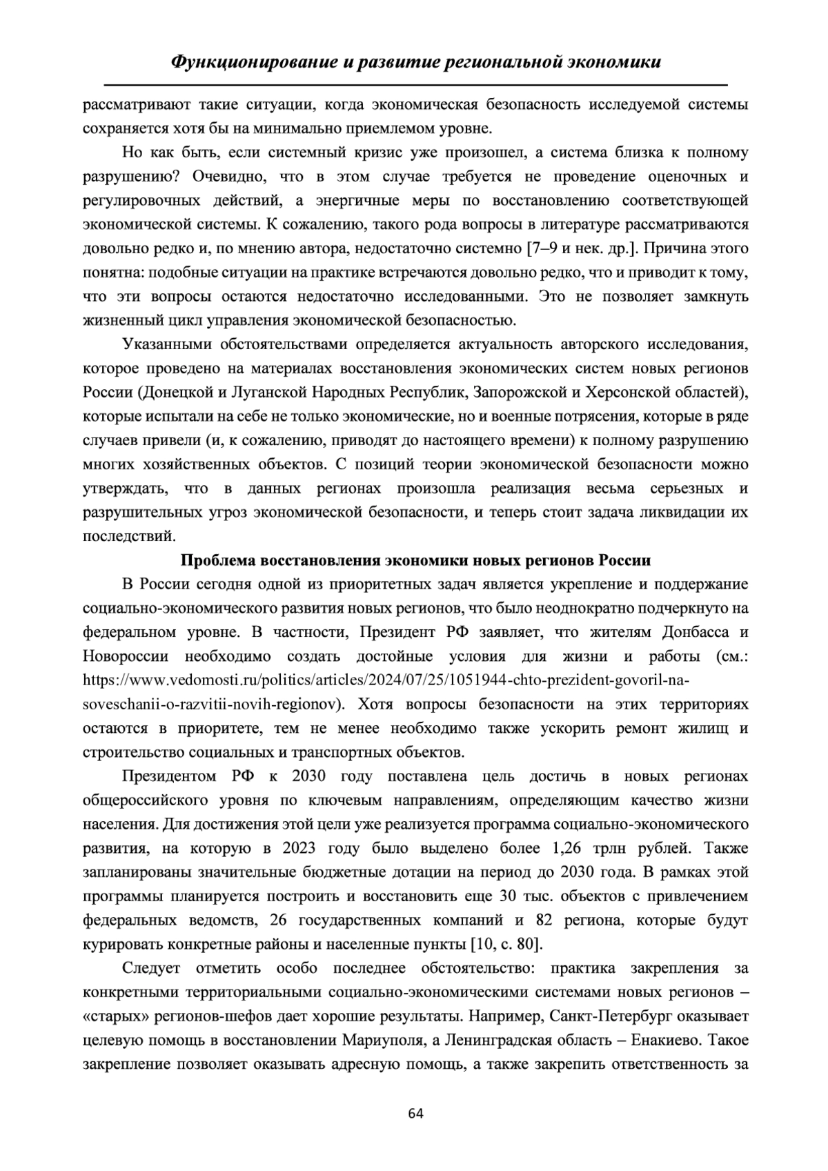 Анализ литературы по экономической безопасности, в том числе – региональной экономической безопасности, показывает, что основное внимание в ней уделяется превентивным и оценочным действиям и процедурам [1–6 и мн. др.]. То есть, оценке достигнутого уровня экономической безопасности, выявлению влияющих на нее факторов, изучению механизма трансформации вызовов в угрозы и – затем – в риски экономической безопасности, разработке мер, направленных на поддержание экономической безопасности на заданном уровне и т. д.