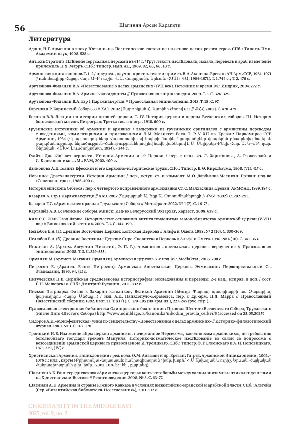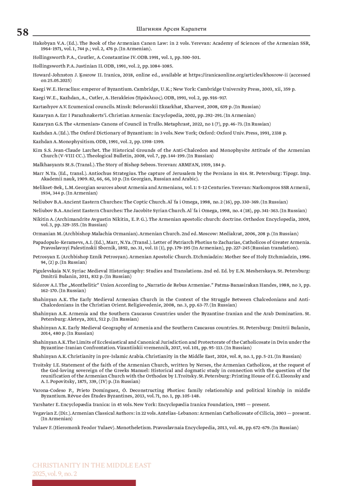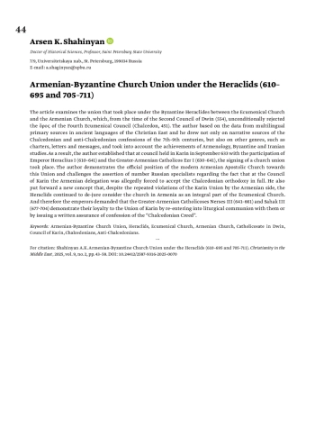ШАГИНЯН А. К. АРМЯНО-ВИЗАНТИЙСКАЯ ЦЕРКОВНАЯ УНИЯ В ЭПОХУ ИРАКЛИДОВ (610–695 И 705–711) // ХРИСТИАНСТВО НА БЛИЖНЕМ ВОСТОКЕ. 2025. № 2, ТОМ 9